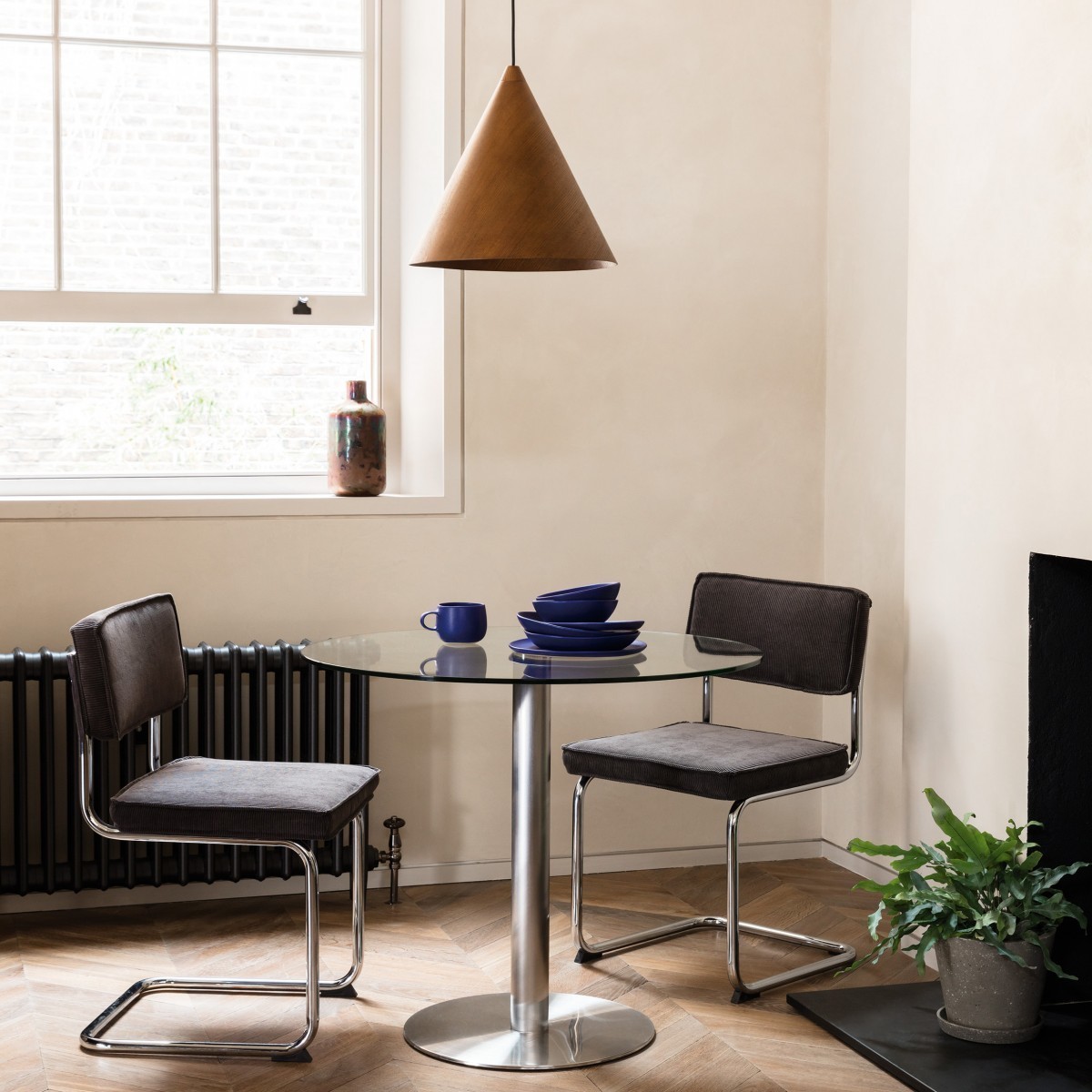 I love this round metal and glass table for its clean, contemporary look that works well in both modern and minimalist interiors. Its compact size makes it perfect for smaller dining areas or kitchen nooks, while the glass top adds a sense of openness and lightness. To style it effectively, consider pairing with sleek chairs in metal or wood for an understated palette, or add a pop of colour with vibrant placemats and tableware for contrast. It’s versatile enough to suit casual family meals or more formal setups, and its simple silhouette allows it to be a functional focal point without overwhelming the space.