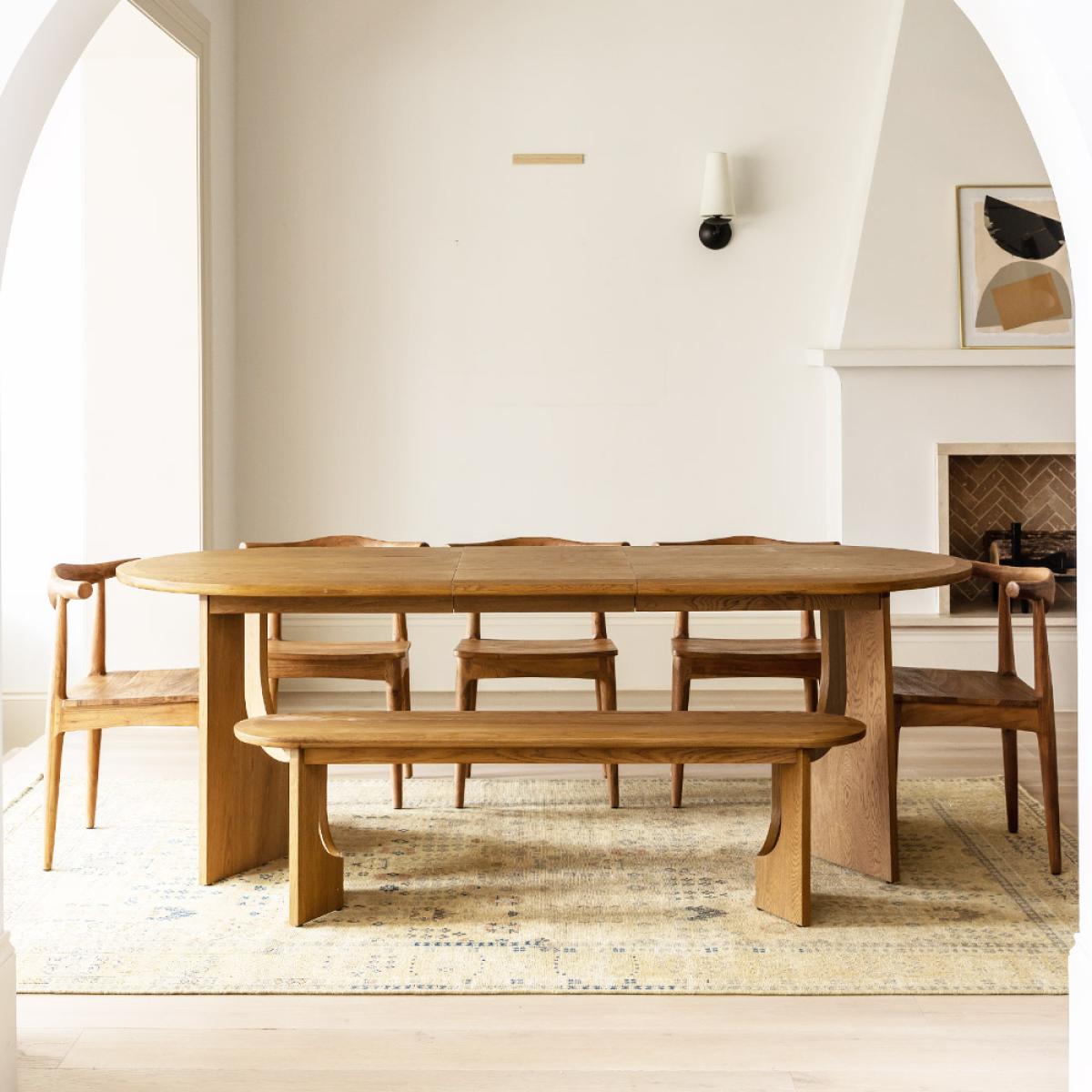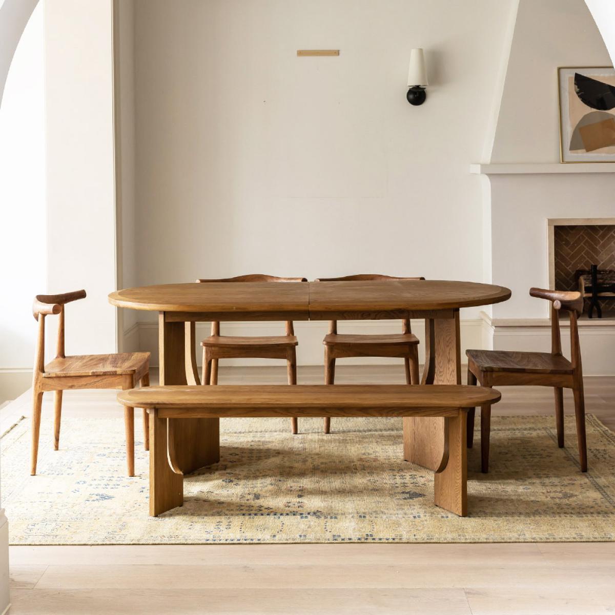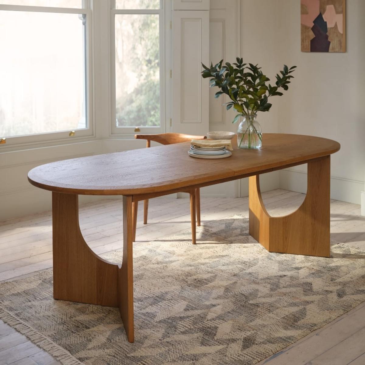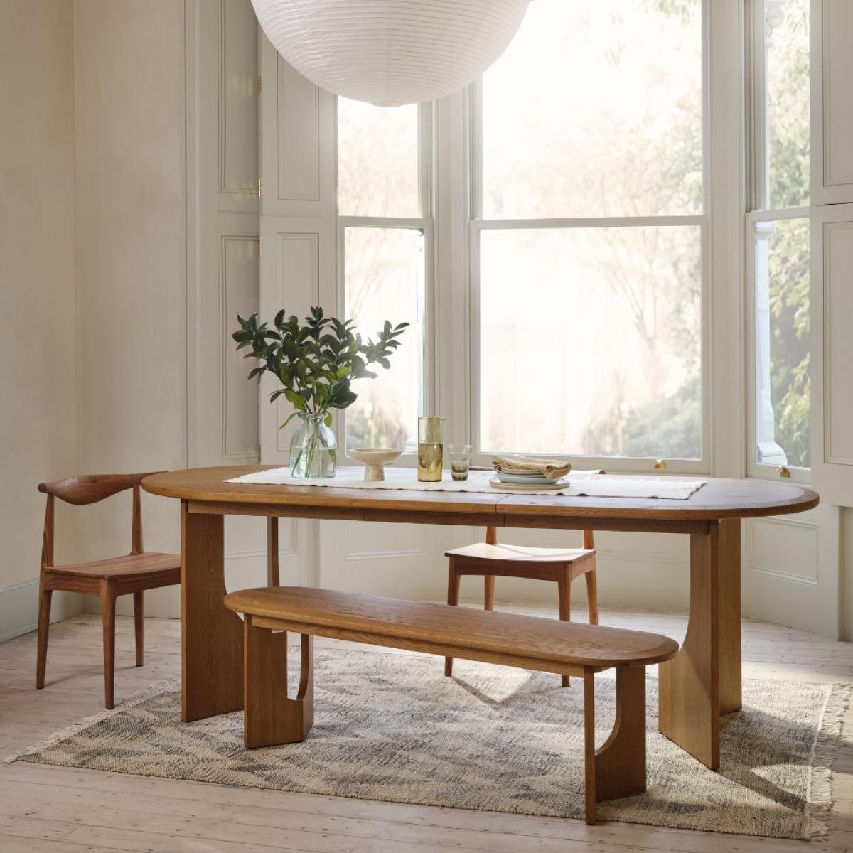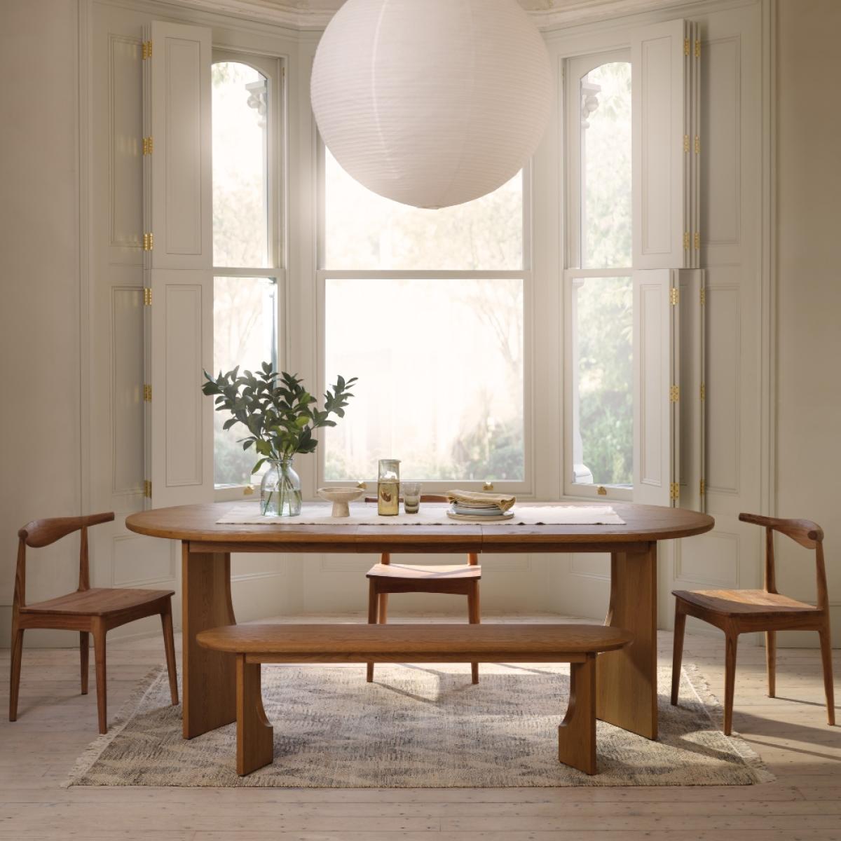 Designed in collaboration with Livingetc, our Umi Solid Oak Extendable Dining Table is a statement piece in a warm bourbon natural oak finish. This large table measures 180cm, and extends to 230cm when required, seating 8 people once extended. With a contemporary, timeless feel, our Umi range is designed to fit effortlessly into your existing decor and to be a timeless piece that you’ll keep in your home for years to come. Our Umi range features a distinctive swooping U-shape which can be seen in this table design in the detail of the wooden base. The table top itself is reassuringly solid, with an ergonomic chamfered edge, and a gorgeous natural wood texture. The table features a discreet locking mechanism on the underside, which releases to reveal the additional solid oak table top panel which is used for extending the table size. Pair with our matching Umi bench to complete the look.