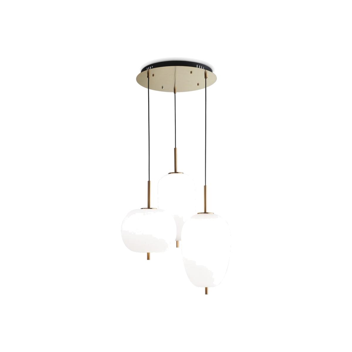 This is an elegant fitting which will add to the dor of the room while providing the necessary illumination in the room. The fitting consists of a satin gold finished ceiling plate, with matching decorative elements. Each of the three diffusers is a different shape, and all three of them are made of white acid etched blown glass. The fitting uses integrated LED light, keeping energy consumption down. Class one.