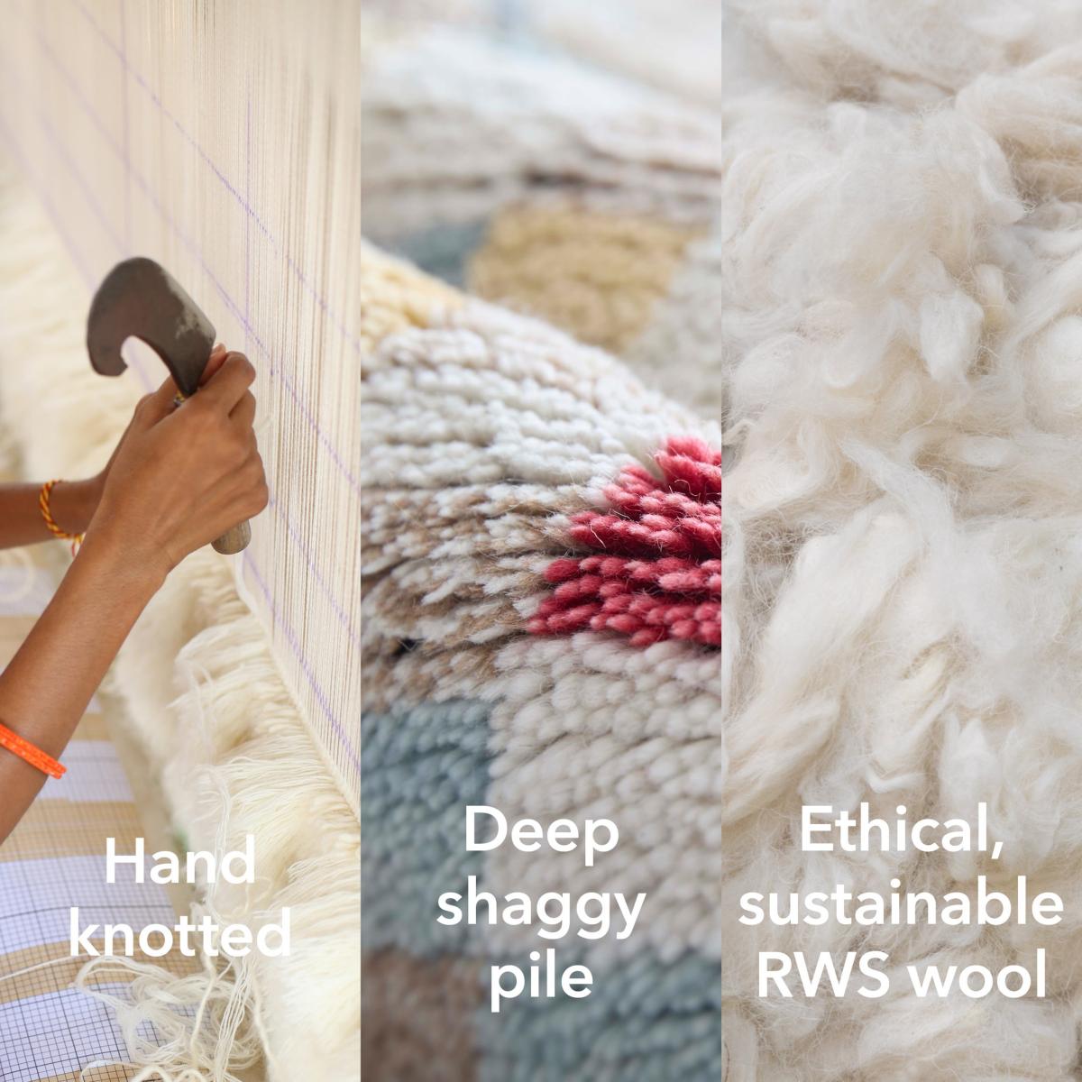 * Hand Knotted Wool Rug* 3/8 Knot Count - Ensures Quality* Soft Luxurious Shaggy Pile* Abstract Checkerboard Design* Each Piece is Uniquely Crafted Over 120 Days Transform your living space with the Umra Premium Hand Knotted Shaggy Wool Rug. This Expertly hand crafted rug features an abstract checkerboard design with a delicate colour palette that would enhance any living space. Hand knotted using traditional techniques, the luxurious soft shaggy pile is caringly woven using durable wool, this rug ensures long-lasting design impact and comfort. Finished with a delicate tassel trim, the Umra rug is the perfect addition to elevate your home décor. Rug pictured is 160cm x 230cm.**Premium Care Guide**We recommend specialist cleaning for your hand knotted rug. This product may shed during the first few months this is normal whilst the fibres settle. Vacuum tufted rugs using a low-suction vacuum setting. For upright vacuum cleaners use a brush tool. Beat loop pile rugs gently rather than vacuuming. Keep away from fire.