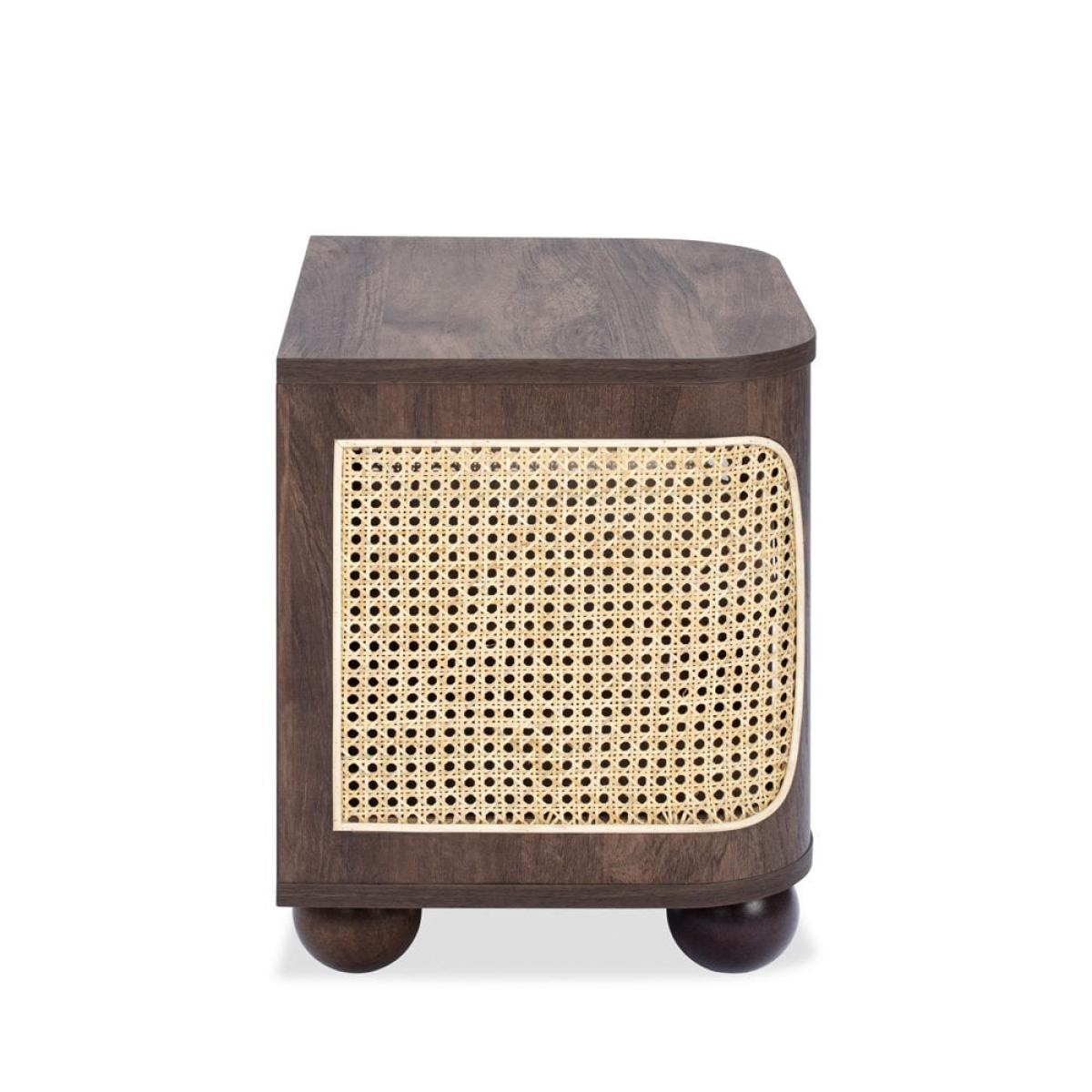 The Una Side Table gives serious retro charm with its statement ball feet, curved edges, and natural rattan side panelling. In a walnut finish that replicates the unique grain pattern of the wood, the Una wooden side table is ideal for use as a bedside table as well. What's more, there is plenty of storage space with open compartment beneath; ideal for your latest home decor pieces and interior magazines. View The Una Range
