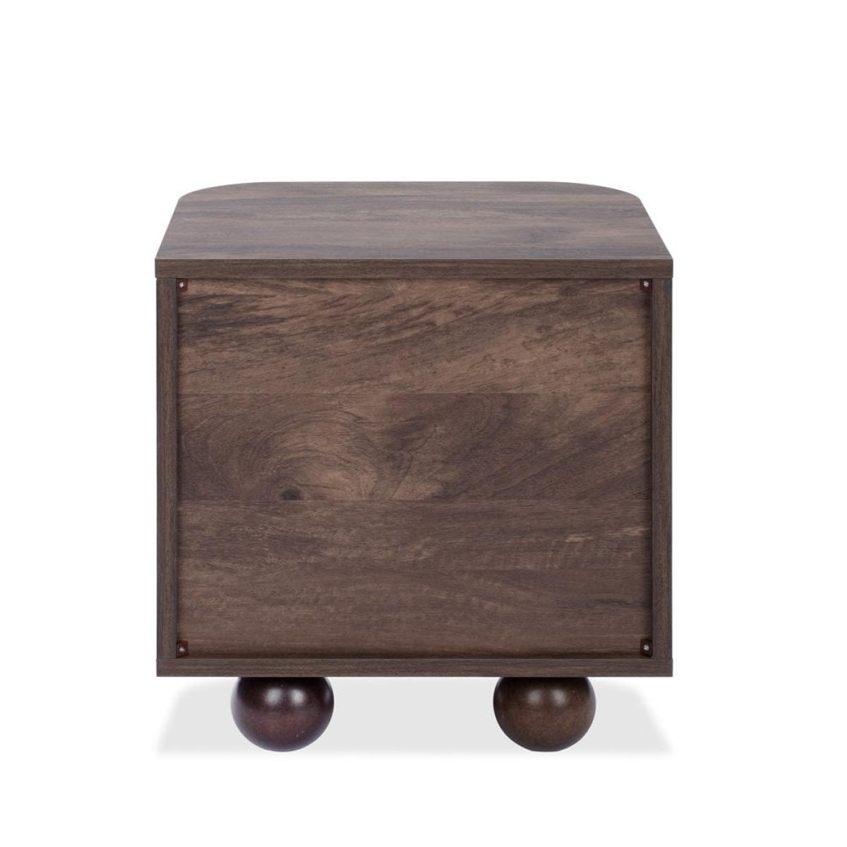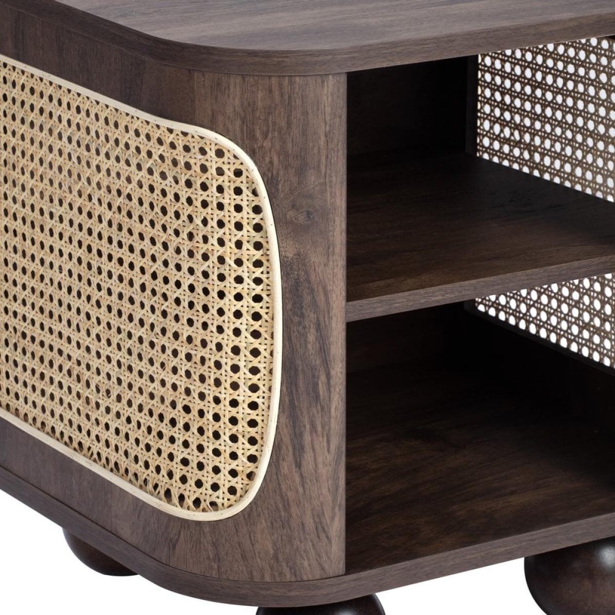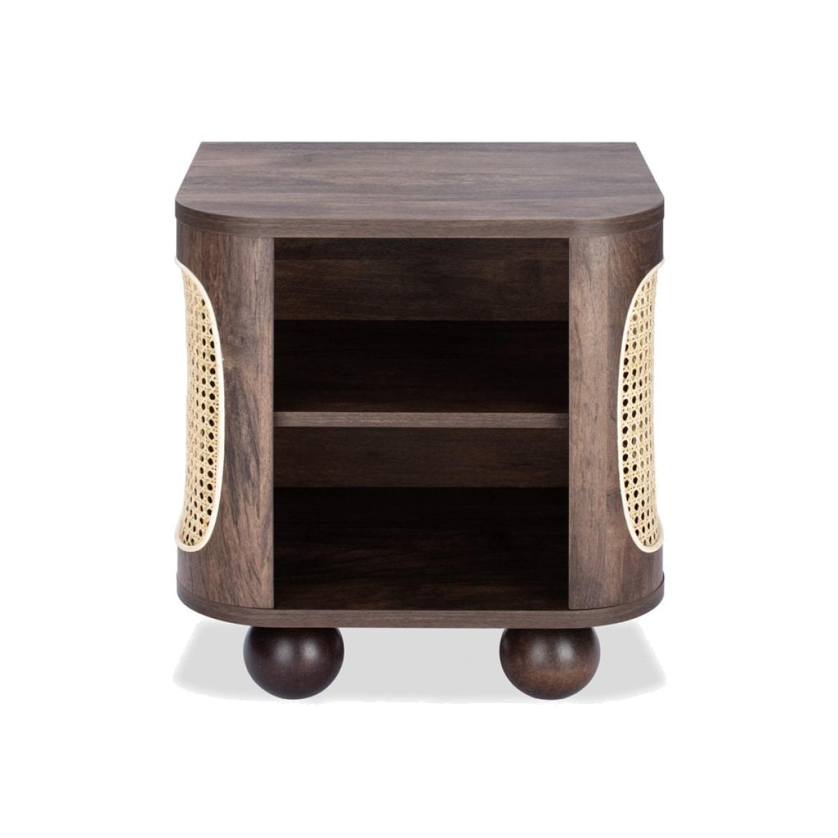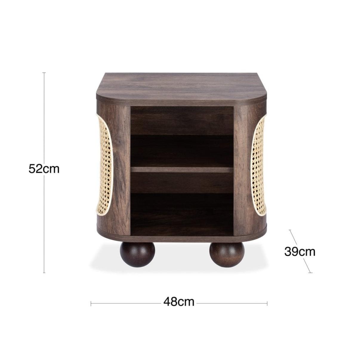 This wooden side table offers a lovely blend of natural materials and understated design, making it quite versatile. I love its warm walnut finish paired with the cane detailing-it adds texture and a touch of craftsmanship that works well in both contemporary and traditional interiors. It's perfect for cosy living rooms or bedrooms where you want a functional piece that doesn’t overpower the space. For styling, try stacking a few favourite books or placing a small lamp and some decorative objects on top, leaving the shelves for additional storage or display. Its rounded edges and bun feet give it a slightly retro feel, so it can be seamlessly integrated into mid-century modern schemes or more eclectic setups.