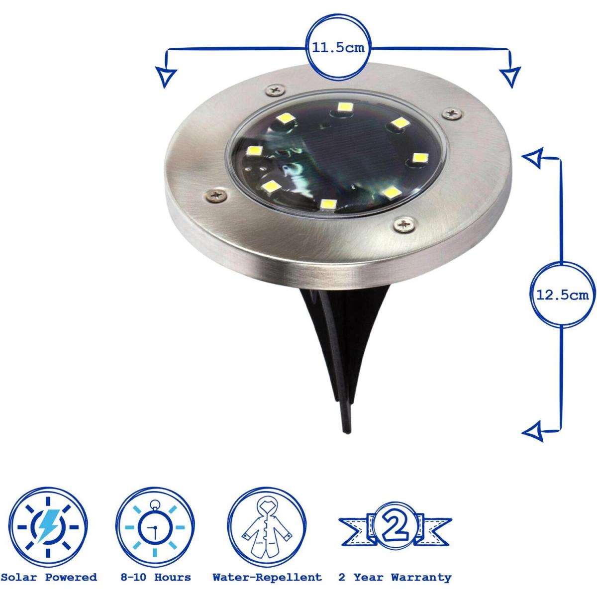 These underground solar path lamps are manufactured from stainless steel durable PP material with 8 bright white SMD LED's plus 2V 80mA solar panel. With no wiring or electricity required, they simply press into the ground with the durable plastic stake. They will light up automatically at night are ideal for pathways, in the garden, while camping at festivals etc. The lights can last up to 100,000 hours approximately and require 1 x 1.2V AA 300m. Ah NiM H rechargeable battery which is supplied.