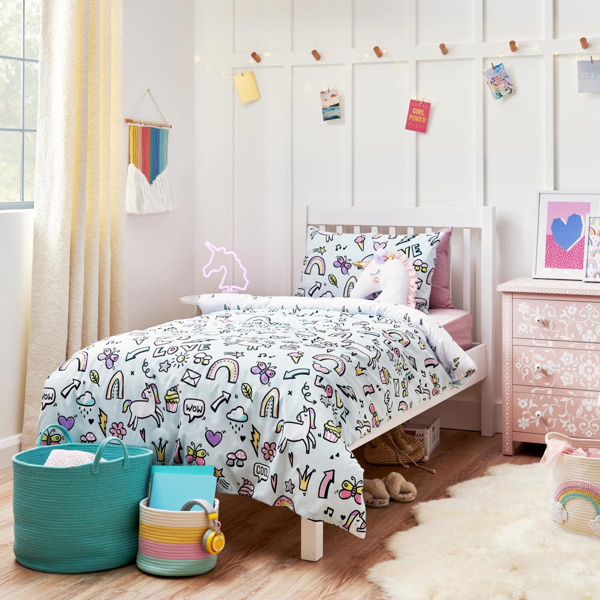 The Unicorn Doodle duvet set is a wonderful choice for adding a playful, colour-rich touch to a child's room. I love how its aqua blue base provides a calming background, making it versatile for both modern and more whimsical interiors. It works well paired with pastel shades or neutral furnishings to keep the space feeling bright and cheerful without feeling overwhelming. For practicality, layering it with complementary cushions or a textured throw can enhance the visual interest, while also allowing easy updates as your child's taste evolves. It’s a fun, lively piece that can anchor a themed room or serve as a friendly focal point in an otherwise minimalist setting.