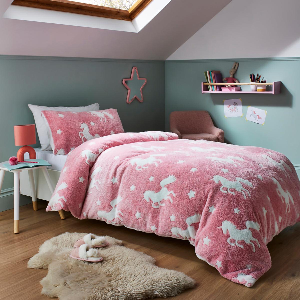 I love the unicorn fleece duvet set because it adds a cozy and playful touch to a child's bedroom, making it both inviting and fun. Its soft pink colour and whimsical unicorn pattern work well in girly or pastel-themed interiors, but it can also add a pop of colour to more neutral spaces. For styling, consider pairing it with simple, solid-coloured bed linens or cushions in complementary shades like blush, grey, or white to keep the look balanced. It’s perfect for creating a bright, cheerful space while also ensuring comfort and warmth during colder months. This set works especially well in a cosy corner or a dedicated sleep area, adding just the right amount of magic for little ones to enjoy bedtime.