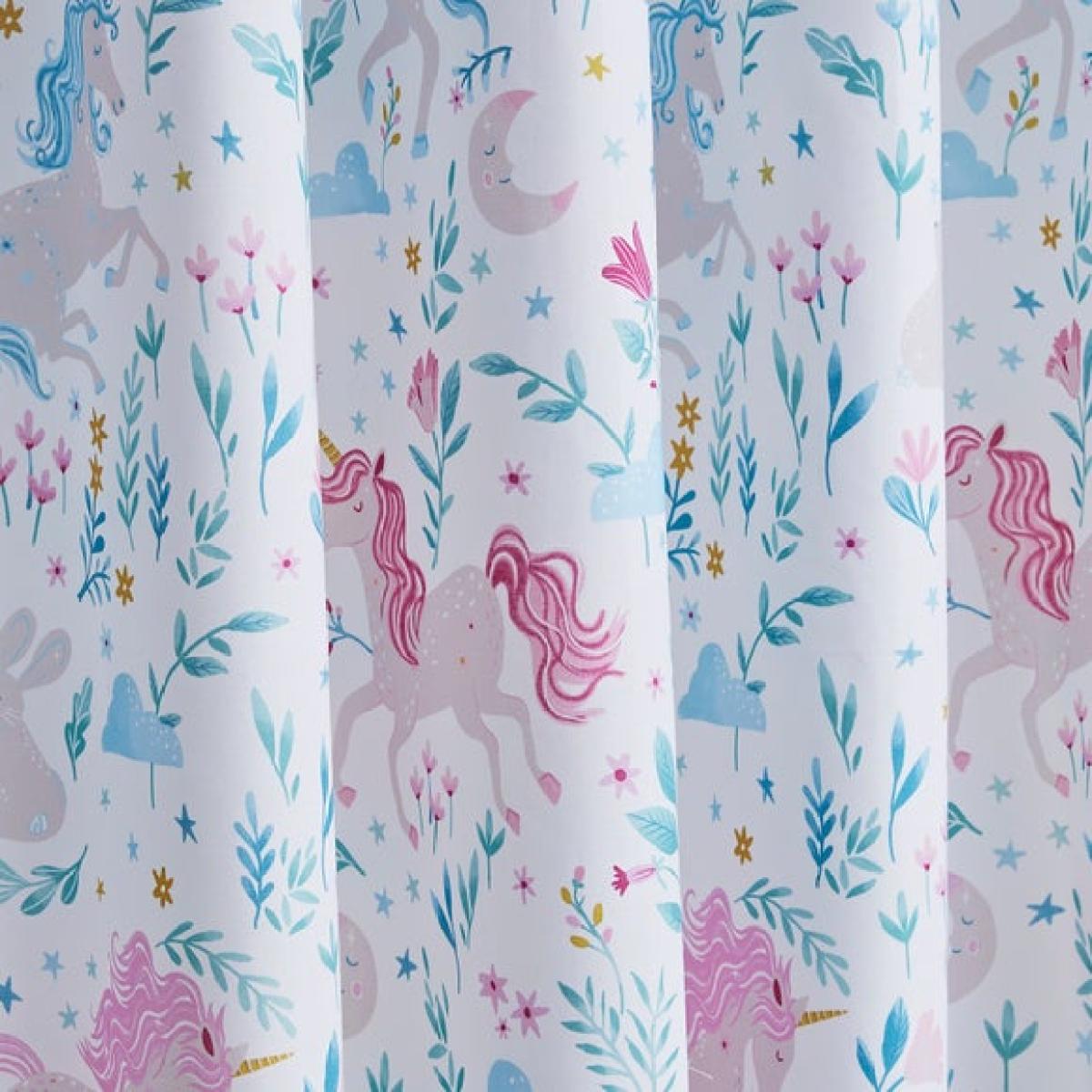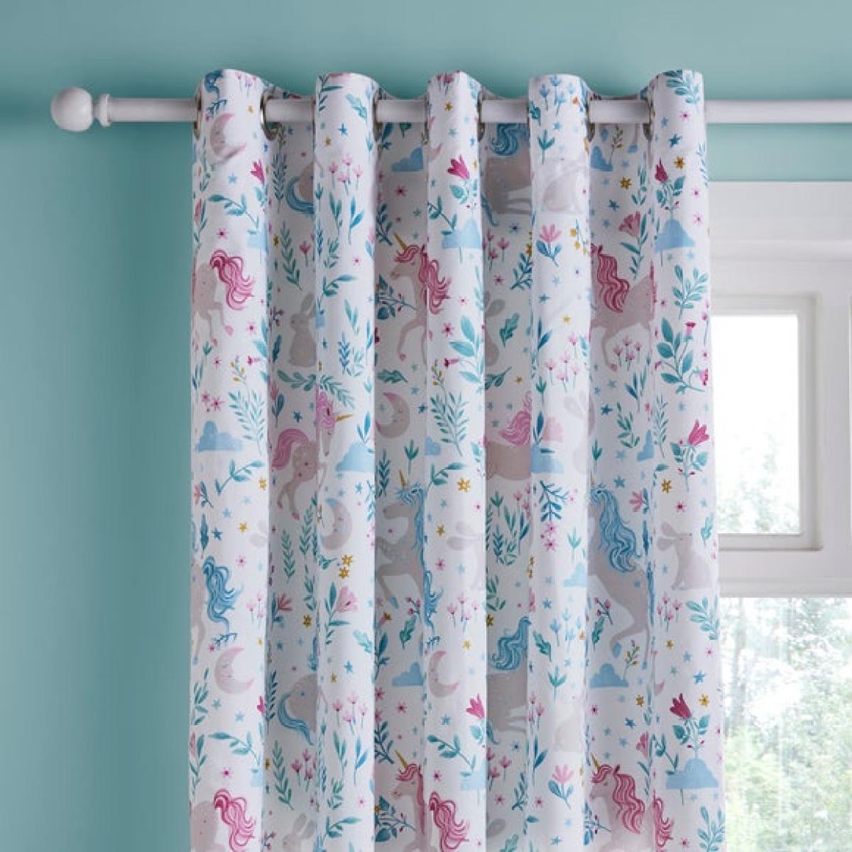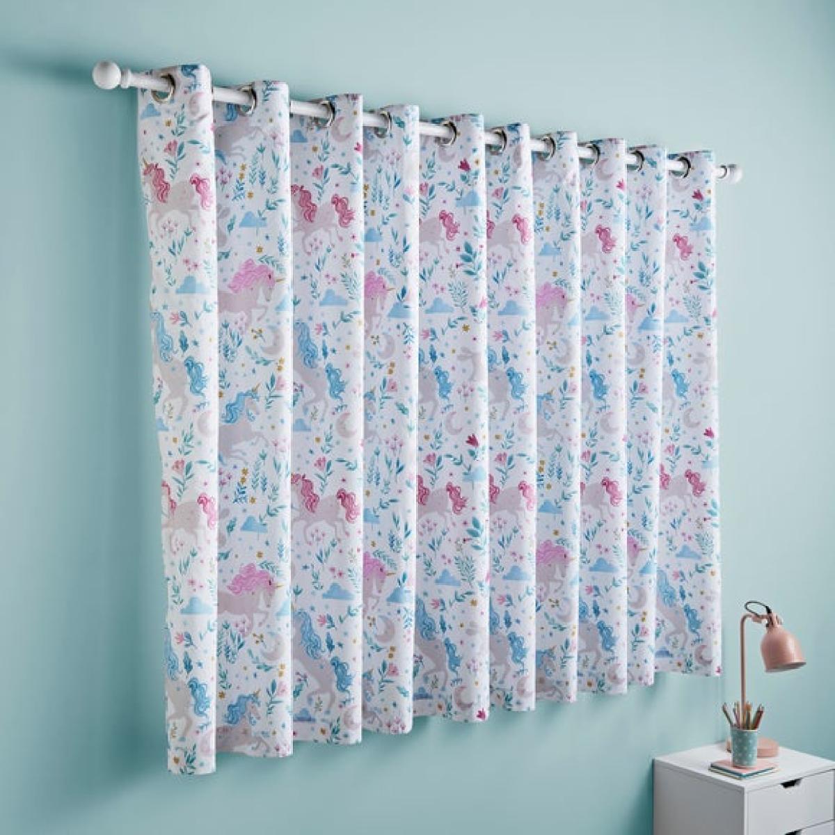 * Soft and Durable Polycotton composition * Enchanting unicorn design * Dry Clean only * Corresponding items available Make magical dreams come true with the Unicorn Meadow Eyelet Curtains. Designed with a delightful pattern of unicorns set in a soft meadow scene, they’re the perfect finishing touch for a fantasy-themed bedroom. Crafted from a soft and durable polycotton blend with a blackout lining, they help ensure restful nights while inspiring wonder. Style alongside matching bedding for an enchanting coordinated space.