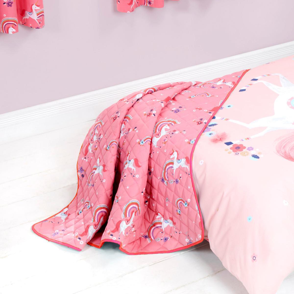 Featuring a pink unicorn print design and crafted from a polycotton blend, this diamond quilted throw fits single and cot size beds, is machine washable and has matching items available. Disclaimer: Our throws are not flame retardant and are therefore not suitable as loose covers on upholstered furniture.