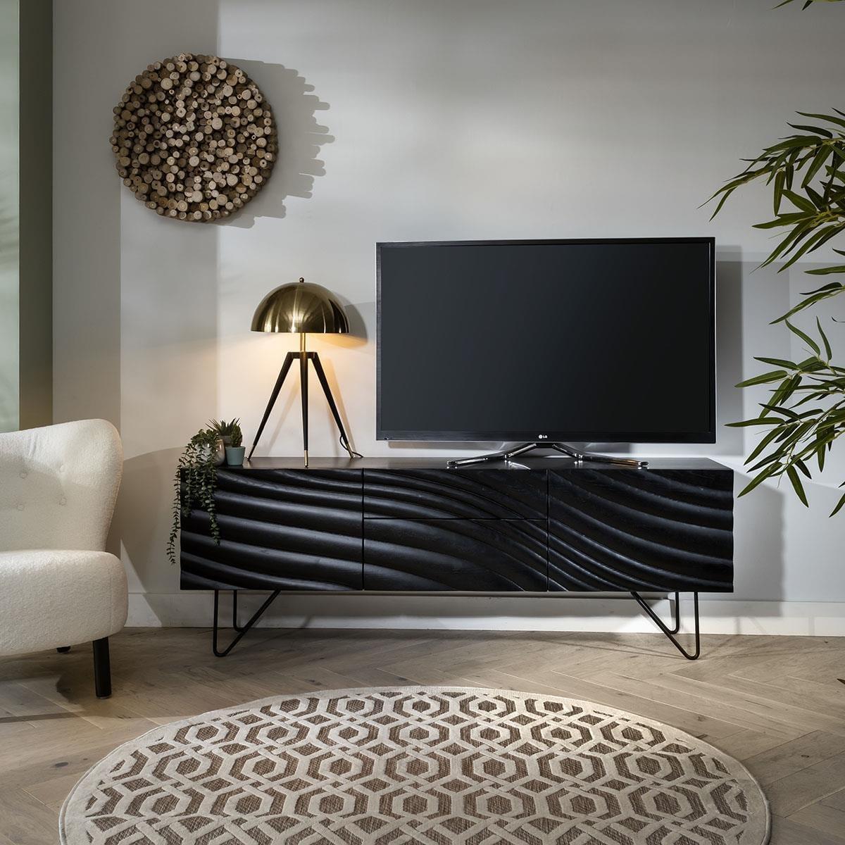 Our Ashlon sideboard is a Nordic-inspired Rich Black Ash Wood Sideboard that allows you to maximise your space. With stacks of storage space inside, our striking Black Ashlon Sideboard comes in an attractive black stained ash wood finish with matching powder coated hairpin legs. The piece uses a glorious combination of straight and curved edges to create something truly unique, ribbed doors on the sideboard create mesmerising flowing lines as they catch the light with highlights and shadows that compose a real sense of depth. The black wood sideboard will add instant wow factor to any interior. It would also make a handy addition to a large hallway or landing. Ideal for crockery, cutlery and glassware in the dining room or for keeping books, games, records and more in the living space. Spread the cost our with interest-free finance options. Minimum spend applies. W180cm D45cm H65cm Nordic Inspired Black Sideboard Cabine Black Stained Ash Woo
