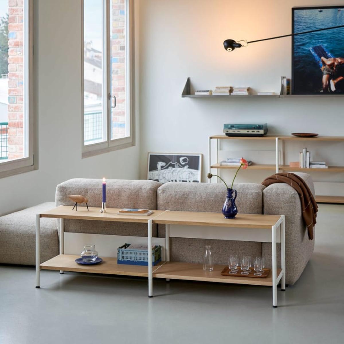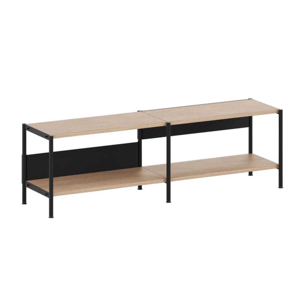 The UNIT Storage system features an elegant, functional design. It consists of Oak shelves that simply fit into Steel ladders, forming an intuitive, visible construction. The structure is secured by steel brackets positioned between each ladder, which are screwed in place with an Allen key (supplied). Fastening clips eliminate the need for screws, making assembly quick and easy. UNIT is available in different heights and lengths, with or without a door... UNIT can be used in every room of the house: as a bookcase, chest of drawers, sideboard, TV cabinet, hallway unit or simple shelf...UNIT is a modular shelving system that stands the test of time. UNIT is made up of just a few components, guaranteeing modularity, repairability and recyclability. UNIT is produced in 100% Europe: the shelves are made from FSC-certified Natural oak, and the structure from powder-coated steel. UNIT is delivered Dish to limit our environmental impact during storage and shipping. The ladders feature positioning pins onto which the shelves are easily clipped. Every element of the UNIT system has been designed for optimum use. Each shelf is equipped with adjustable jacks to adapt to uneven floors. Doors and drawers feature elegant folded steel handles. Cable guides (5cm opening) are located at the bottom of the doors. Each shelf can support a maximum load of 30 kg, correctly distributed over the entire surface. The UNIT shelving system is modular and can evolve over time according to your needs. If you would like to upgrade your UNIT shelving system with an additional column, drawers or doors, please contact our customer service department, who will be happy to assist you in the realization of your project. In detail: Variation : Graphite black / Oak Brand : TIPTOE Type : Low console, Low shelf Colour : Structure: Graphit black - Shelves: Natural oak Material : Structure: powder-coated steel - Shelves: FSC eco-certified oak Dimensions :W 164 x D 42 cm x H 50 cm Weight : 110 lb Characteristics :Modular shelving system - Delivered unassembled (simple assembly with clips) - Sturdy, durable materials, 100% made in Europe - Eco-certified Wood - Adjustable jacks to adapt to uneven floors - Max load: 30 kg per shelf Show less