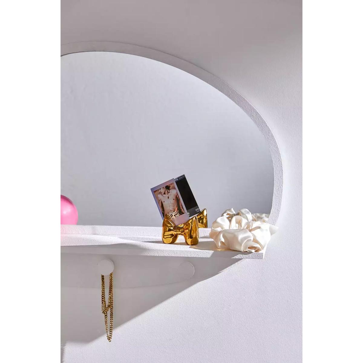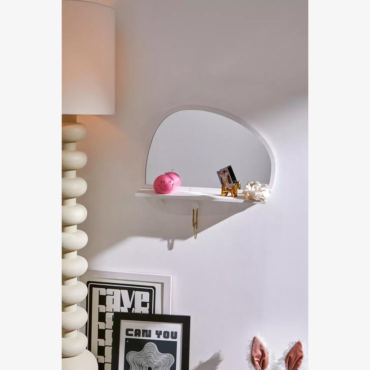 Contemporary curved mirror with a practical shelf underneath, exclusive to the UO Isobel collection. Complete with three circular hooks for hanging coats or accessories underneath. *Online return only. This item cannot be returned instore. Please note furniture items currently cannot be shipped to Northern Ireland or The Republic of Ireland. Delivery of large furniture items may take 1-2 weeks and are therefore not eligible for Next Day Delivery.* **Content + Care** \- Fibreboard, Glass **Size + Fit** \- 60cm x 12cm x 47cm