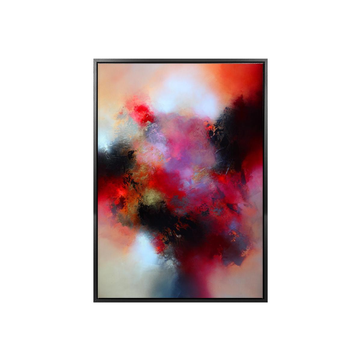 I love this piece for its bold, contemporary feel, making it a striking focal point in any modern or eclectic interior. The abstract design and vibrant colours work particularly well in minimal spaces, where it can add personality without overwhelming. It pairs beautifully with neutral-toned furnishings, but can also tie into a colour scheme that includes reds, purples, or blacks for a cohesive look. Practical styling tips would be to hang it slightly above a sofa or console table for balanced visual interest, and consider layering with other artwork or decorative accessories to create a curated gallery vibe. Its size and presence make it versatile, easy to incorporate into living rooms, bedrooms, or even a stylish home office.