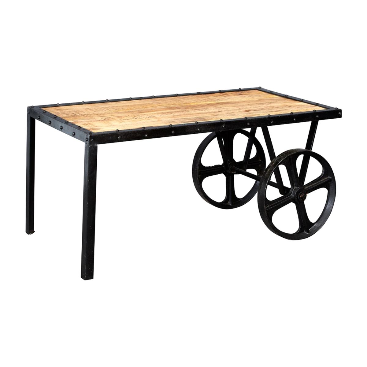 Up-cycled reclaimed industrial cart coffee table medium featuring wood and metal. The light grain hardwood is left in its natural state and colour with natural variations and slight cracking with a banded iron edge.