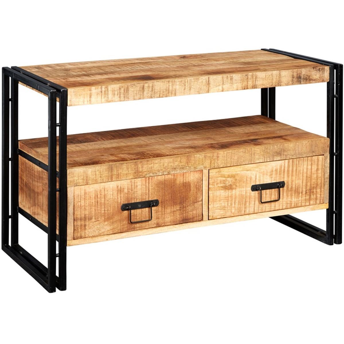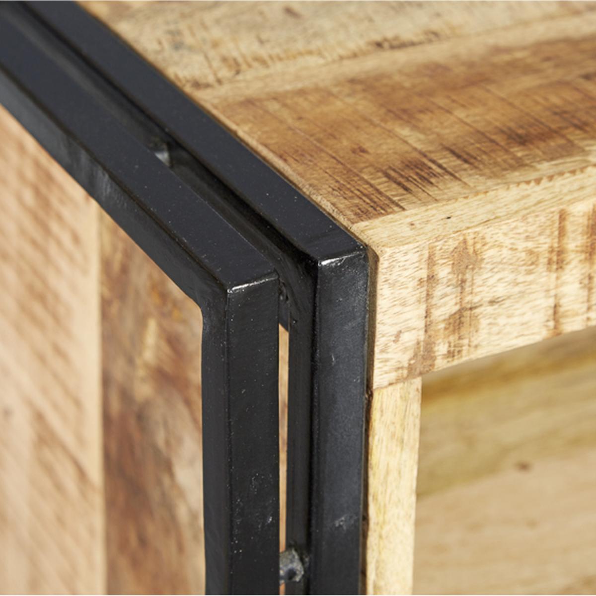 This television cabinet is going to be the centrepiece of any well-appointed living room. It has a stylish modern design that is sure to draw compliments the next time you have guests over. The wood used in this piece is reclaimed. That means that it is good for the environment, and also unique. No two cabinets are the same. The black colour of the frame is a nice contrast to the light brown of the wood. On top, it has a generous amount of space, which will give you room for even a large flat-screen television. Below that is an open storage area.