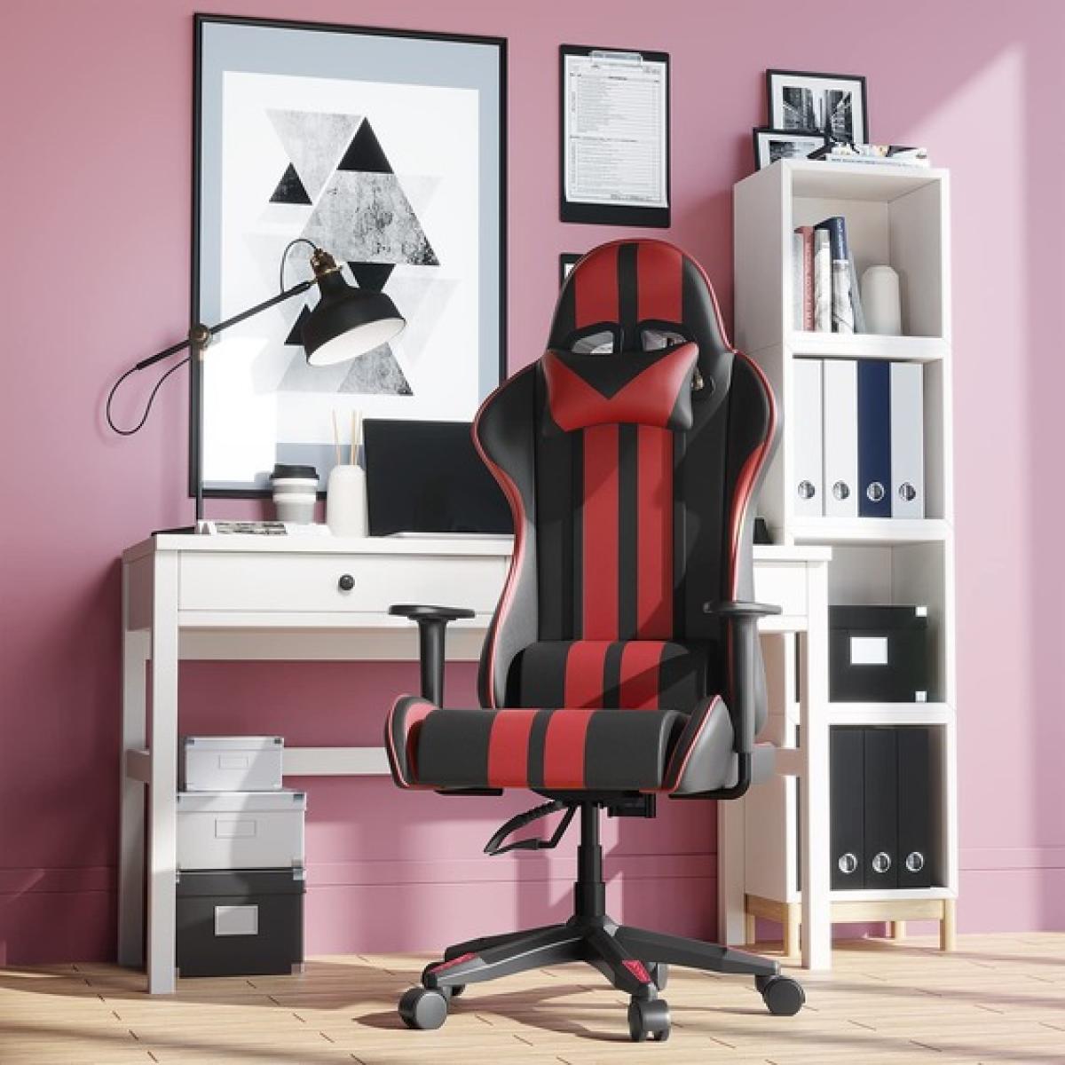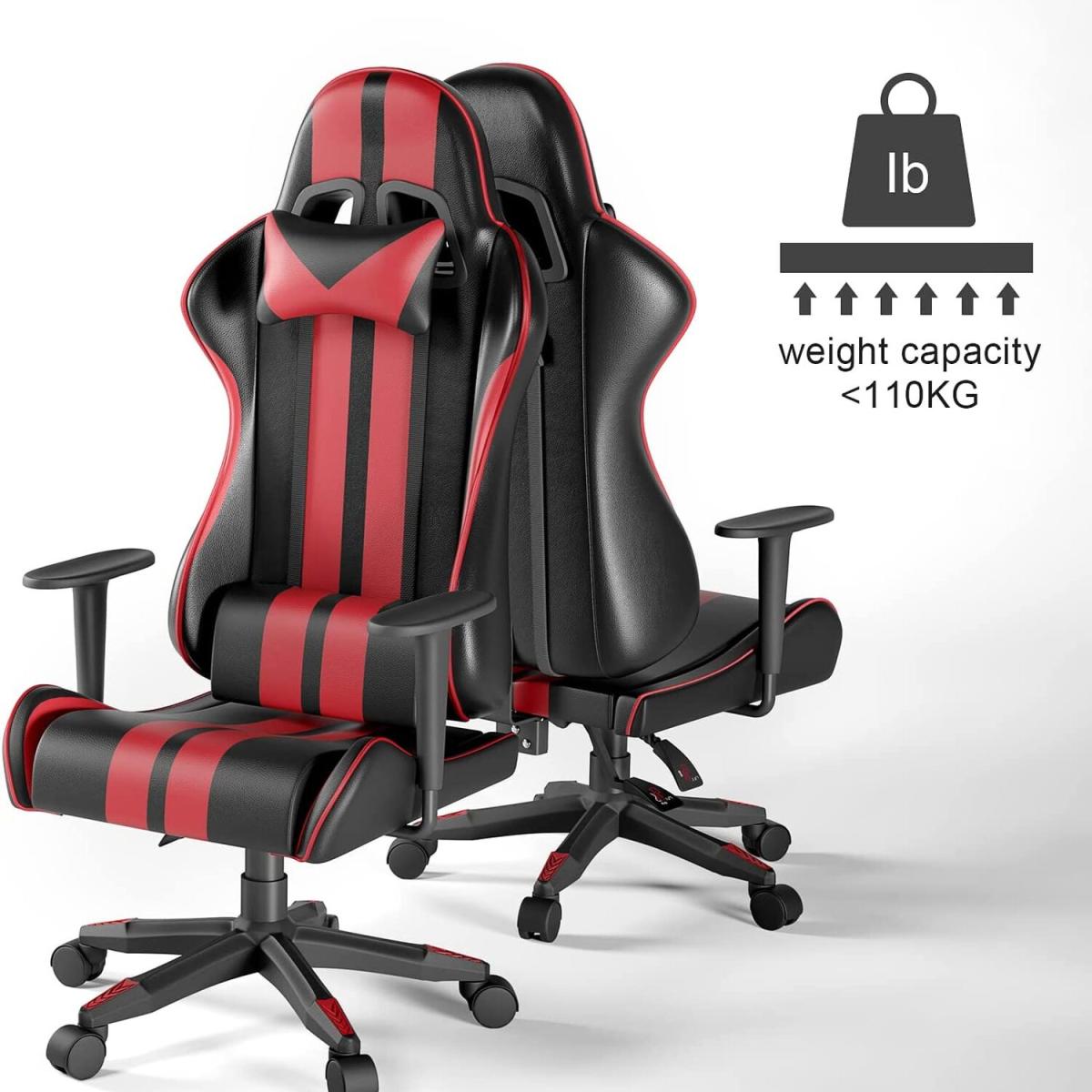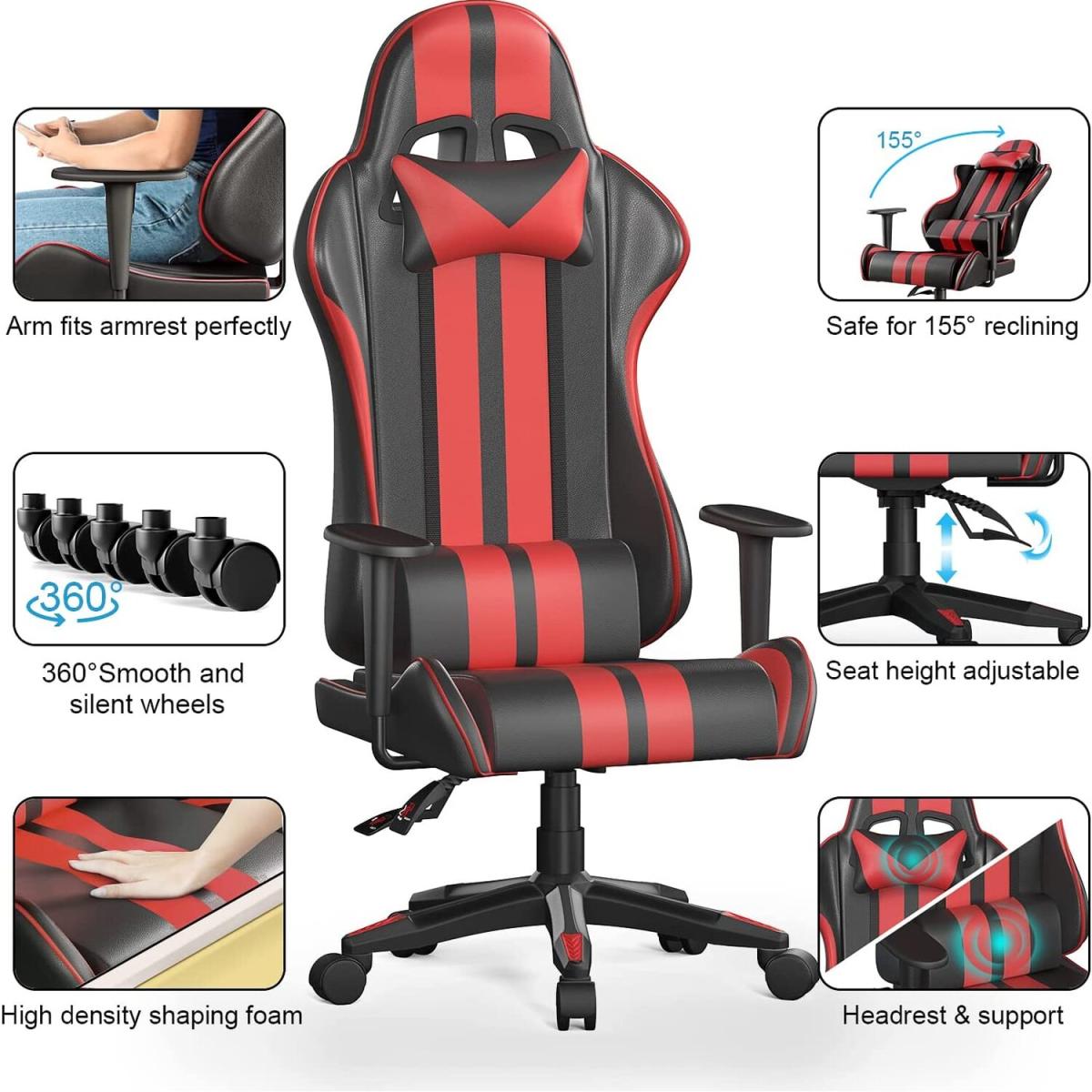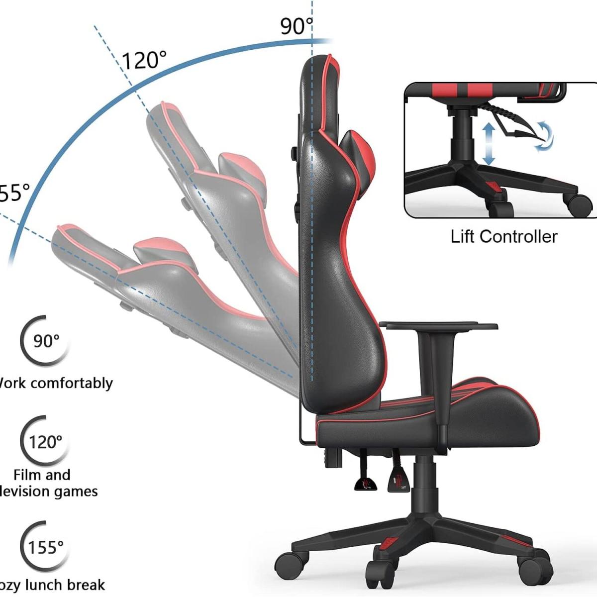 The gaming Chair is not only equipped with a high back but widened back and seat without being squeezed by the backrest and seat cushion. Upgraded the T back bar to Steel Plate, adding 100lbs of shock load. The strong integrated metal frame, heavy-duty base, and explosion-proof cylinder provide more safe protection for you. High premium faux leather gaming chair for prolonged sitting. Ditch the cheap material, skin-friendly and soft gaming chair leather material that is resistant to scratches, stains, peeling and cracking, while also being breathable.