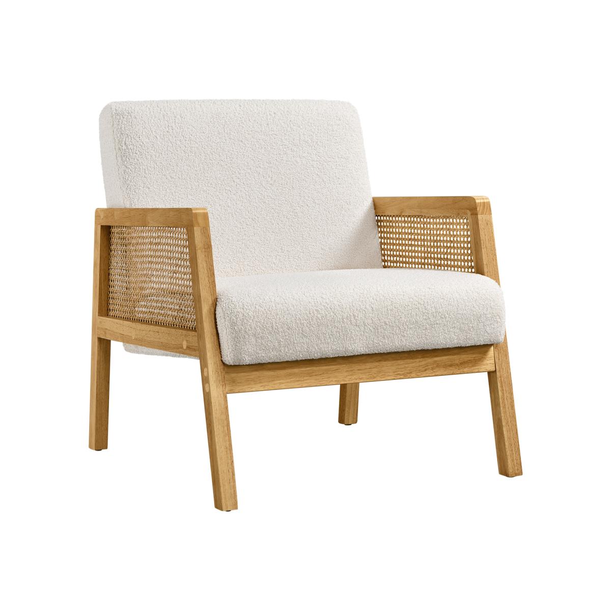 Adds a beachy look to your sitting area with this upholstered armchair. Its rectangular, cane-paneled arms, splayed legs and cozy fabric upholstery add a stylish and elegant touch to your space. It's crafted with a solid wood frame and sits on tapered rubberwood legs in a natural hue. A slanted backrest and extra-wide cushioned seat along with long armrests provide ample comfort and support in any seating position. This chair is upholstered in polyester that is breathable and close to the skin. The high-density foam-filled seat is supported by four sinuous springs, extending its service time. A simple design meets a warm, neutral color palette, making it ideal for living rooms, bedrooms, home offices, sunrooms, lounges, balconies and more.