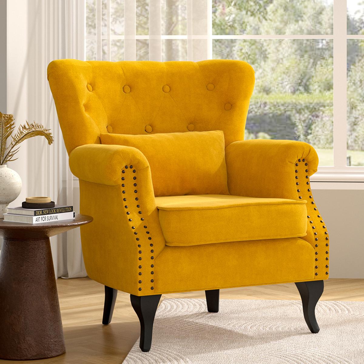 Upholstered Buttoned Armchair with Pillow and Cushion - Yellow