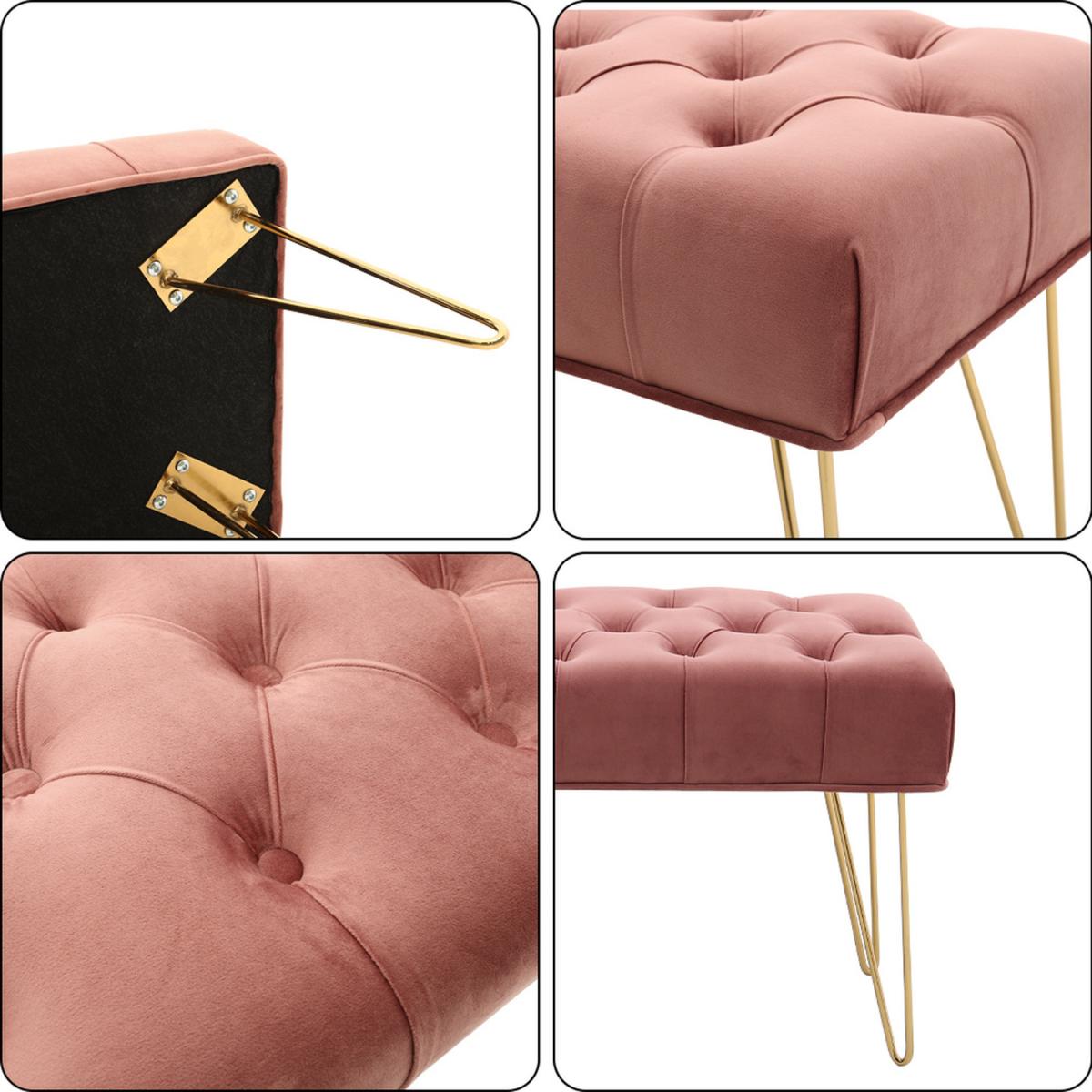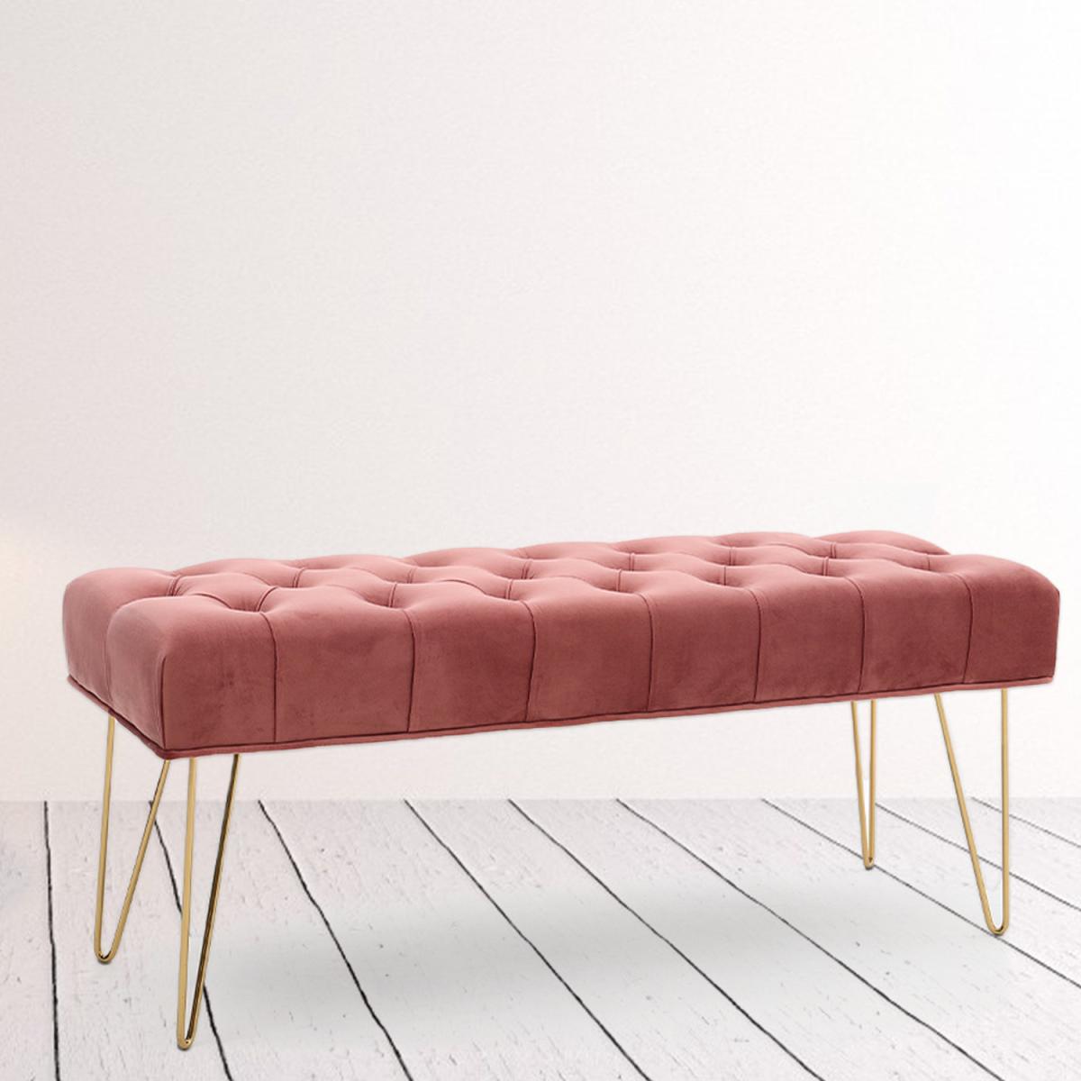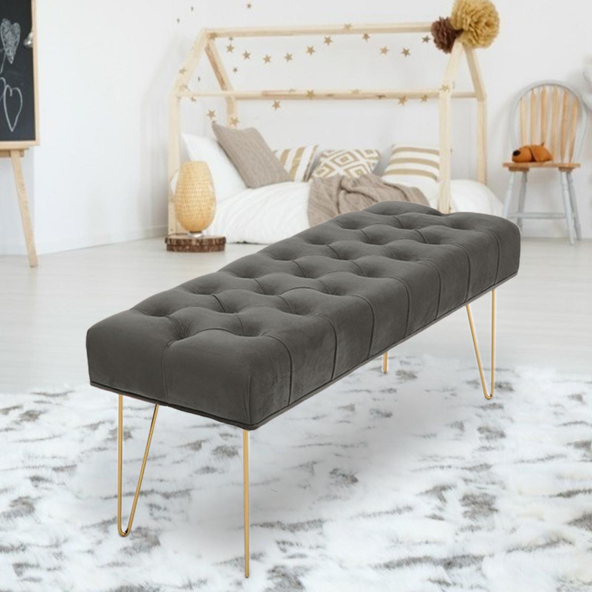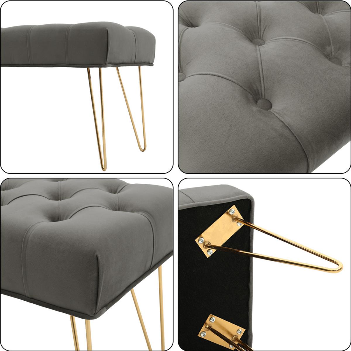 High quality velvet fabric, soft to touch but hard wearing, padded with high-density foam that is bouncy and elastic to sit on. Buttoned seat in style, extra beauty and appeal, gives this bench some luxurious charm. The bench itself has a wide and large sitting area, users can sit or lie on the bench comfortably. Velvet-look upholstery is smooth, breathable and can be spot cleaned easily. Galvanized legs ensure a solid and tough frame, keeping it balanced. Foot pads protect your floor. It Can be used in the bedroom, hallway, spare room, office and living room, creating an extra seat where needed.