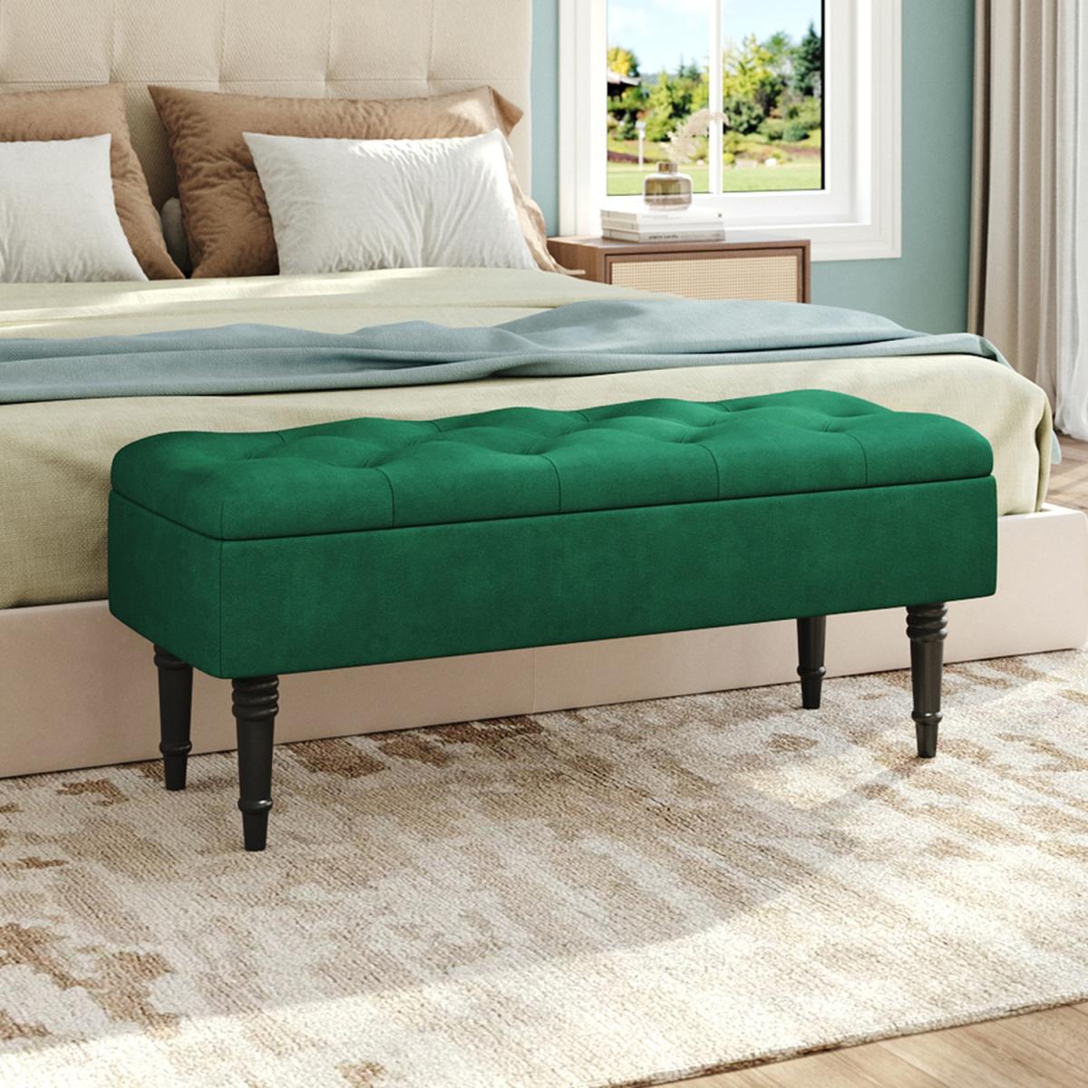 This upholstered storage bench is supported by rubberwood legs and filled with dense foam. Super soft velvet wraps around the sturdy wooden frame. The button-trimmed upholstered seat is a classic and luxurious look, and the bench legs have been specially designed to be elegant and good-looking, adding a new trendy touch to your home. In addition, its top can be opened and the interior is perfect for storing your books or pillows. You can place it at the end of your bed or at the entryway and anywhere else you need it as storage space and additional seating.