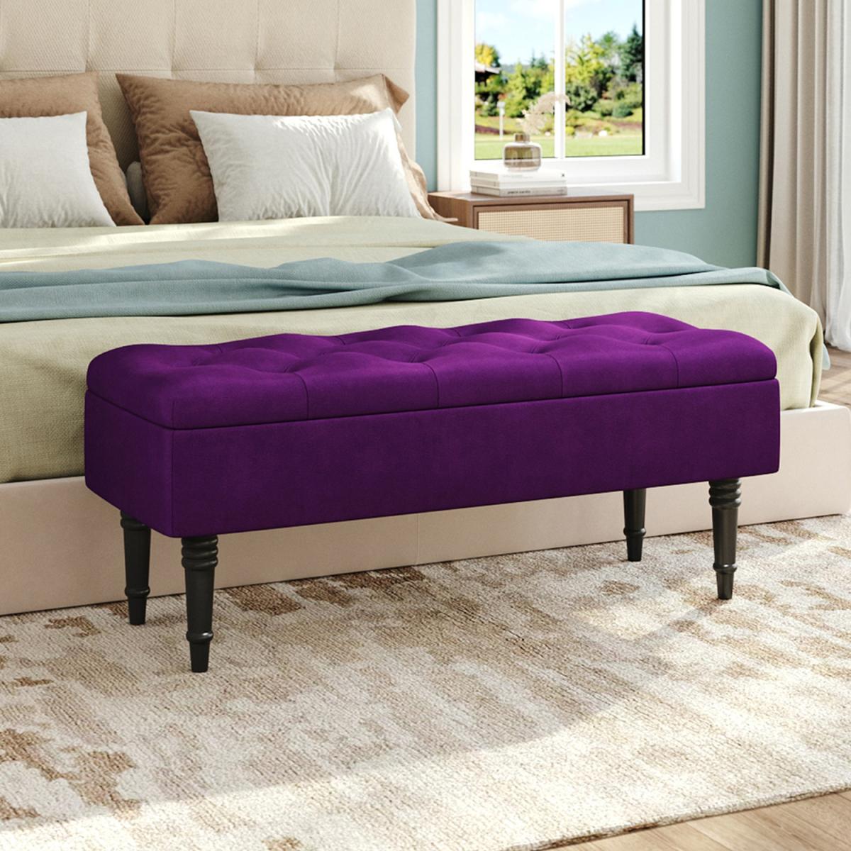 This upholstered storage bench is supported by rubberwood legs and filled with dense foam. Super soft velvet wraps around the sturdy wooden frame. The button-trimmed upholstered seat is a classic and luxurious look, and the bench legs have been specially designed to be elegant and good-looking, adding a new trendy touch to your home. In addition, its top can be opened and the interior is perfect for storing your books or pillows. You can place it at the end of your bed or at the entryway and anywhere else you need it as storage space and additional seating.