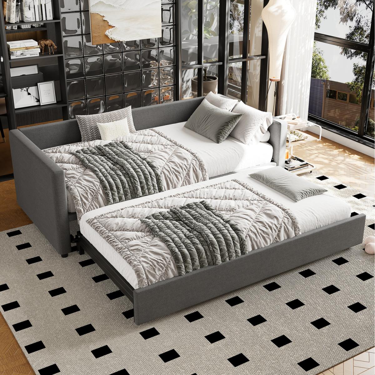 The upholstered single bed features a pull-out bottom bed that can be used to create a spacious double bed, making it perfect for accommodating guests or providing extra sleeping space. This daybed sofa bed boasts a modern and sleek appearance, featuring grey linen upholstery, making it a stylish addition to any room while providing practical sleeping solutions for both adults and teenagers. Designed to optimize space, this bed is ideal for smaller rooms or apartments. The pull-out bed provides an easy way to maximize sleeping areas without taking up additional floor space when not in use. Crafted with high-quality materials, the bed ensures durability and comfort. The linen upholstery is not only aesthetically pleasing but also adds a soft and cosy touch, ensuring a good night's sleep. This youth bed comes with straightforward assembly instructions, making it easy to set up. With minimal effort, you can have this functional and stylish piece ready to use in no time, perfect for busy households.