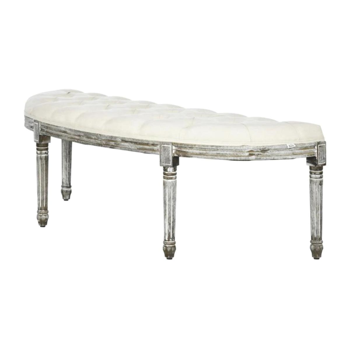 This bench features an elegant half-moon shape adorned with button tufting across its top and a wood grain-brushed effect finish. Delicate carved accents on the legs enhance its sophisticated, slightly vintage appearance. Upholstered with 28cm sponge filling, the bench provides a plush seating experience, ensuring you can sink in comfortably and relax. Crafted with a sturdy wooden base and four evenly-spaced legs, the bench offers reliable support and stability while seated. Adjustable foot pads enable it to remain balanced on uneven surfaces. Designed with an open bottom, the bench provides convenient storage space for shoes and bags, keeping them neatly organized yet easily accessible. The bench offers generous seating capacity and can support a maximum load of 120kg.