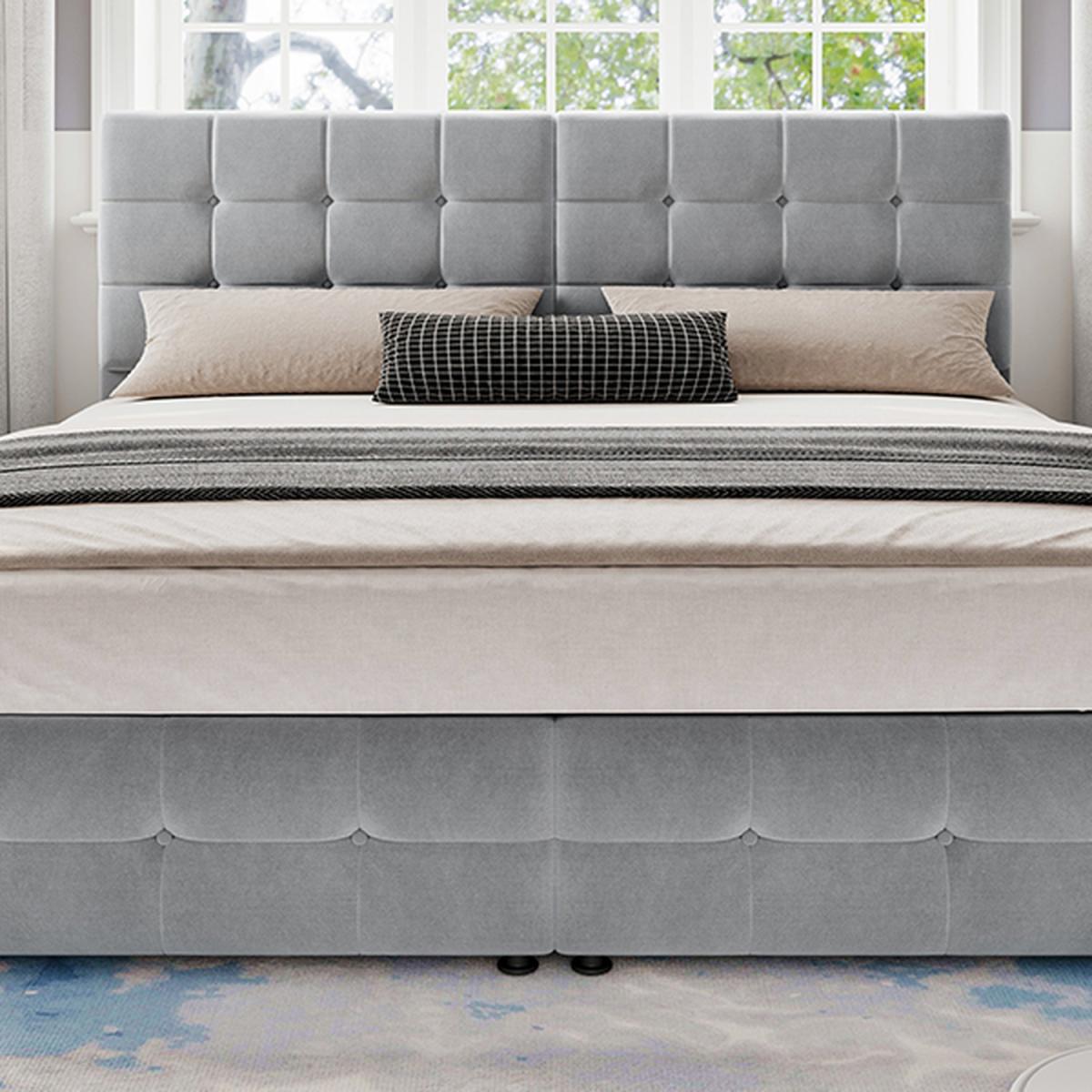 Elegant Design,With thick checkered foam backrest, this upholstered double bed (180x190 cm) has a stylish and sophisticated look and a fine touch. Separable and spliced beds, This double bed is made up of two 90*190cm beds. It can be put together to become a 180*190cm large bed, or it can be separated and used as two small beds. It is suitable for families with many children, entertaining guests, renting a house, and other different scenarios. Hydraulic Lift Storage, The bed includes a hydraulic lift mechanism that offers ample under-bed storage space, perfect for keeping extra bedding, clothing, or other items neatly organized and easily accessible. Durable Construction: Made from a combination of luxurious velvet and sturdy iron, this bed ensures long-lasting comfort and durability while adding a touch of elegance to any bedroom decor. Practical storage function,This upholstered bed is designed with bed hydraulics and the left and right sides can be easily pulled up and down. Provides practical storage space for books, toys, clothes, suitcases or other daily necessities. Easy to Install, Detailed instructions and complete parts can help you complete the assembly. The fun of installation makes you enjoy the bed more.