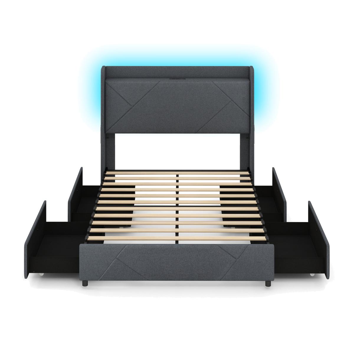 Upholstered Platform Bed with Charging Station - Grey