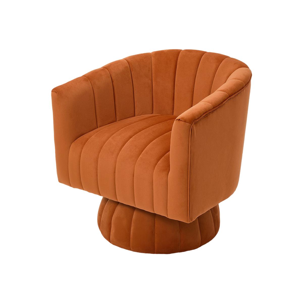Indulge in luxurious comfort with the upholstered swivel accent armchair! The orange hue creates a warm and inviting ambience, adding a touch of sophistication and vibrancy to any space. Its backrest and arms flow seamlessly into a beautiful and streamlined barrel shape that exudes contemporary charm. It offers unparalleled support and relaxation, whilst the upholstery is accentuated by exquisite channel stitching. The 360-degree swivel base with non-slip feet pads greatly enhances flexibility and convenience, allowing for effortless seat adjustments and a clear view. Whether used as an accent piece in the living room, a statement chair in the bedroom, or a sophisticated addition to an office, this armchair effortlessly enhances any space.