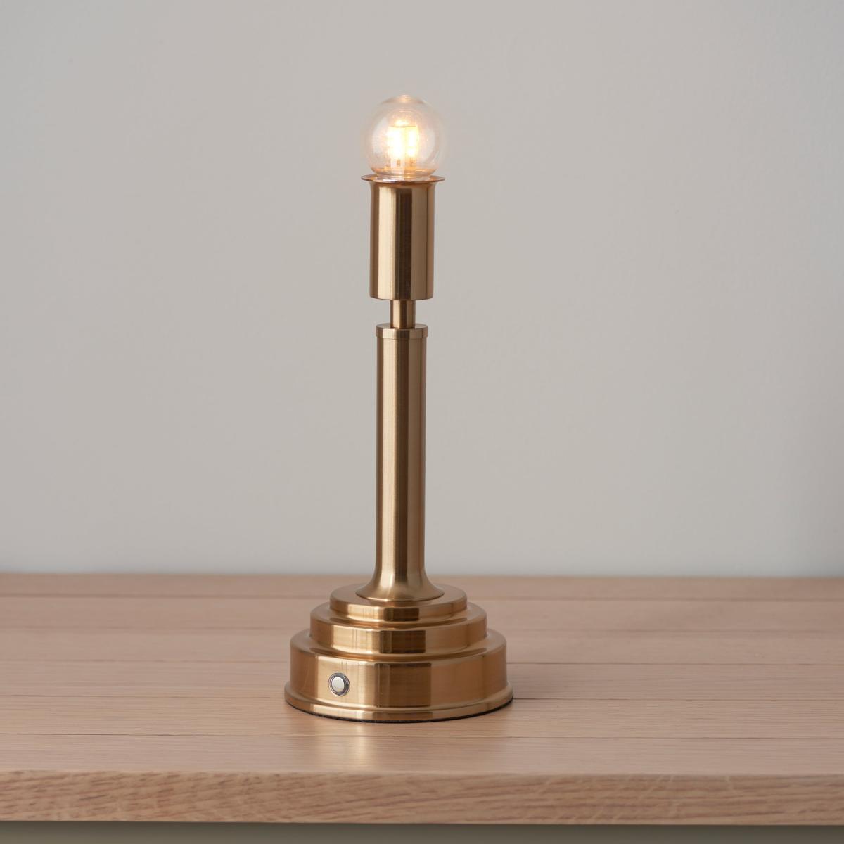 Not tied down by the need for a power cable, this portable, rechargeable 3 stage touch dimmer table lamp enables you to select your own level of light. Classic in style with stepped base and finished in aged brass making it easy to place around your home. Turns on for low light then touch controlled to increase light level to medium then bright, making it the perfect bedside light. Taking just 5 hours to fully charge and giving up to 30 hours of continuous light. Be creative! Place on shelving, hallways, bedsides or dining tables, a totally versatile addition to your home. Pair with one of our 16cm decorative clip-on shades for the perfect timeless style.