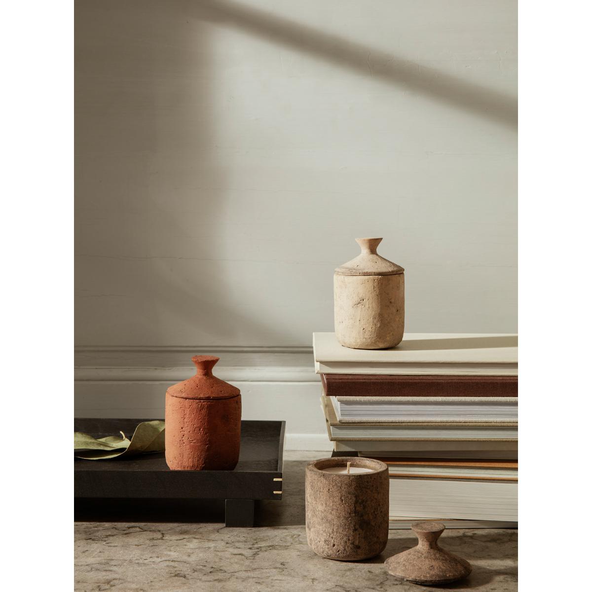Ura scented candles come in a handmade urn made of stoneware with a matching lid. The urn has a unique and raw surface and the terracotta lid has a knob on the top that makes it easy to handle. Place your favourite scented candle in the living room or in the bathroom so it's part of the interior design and light it for a relaxing moment.