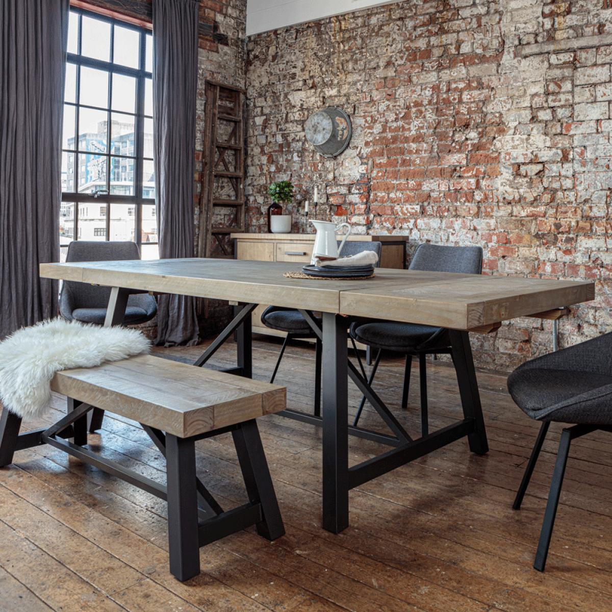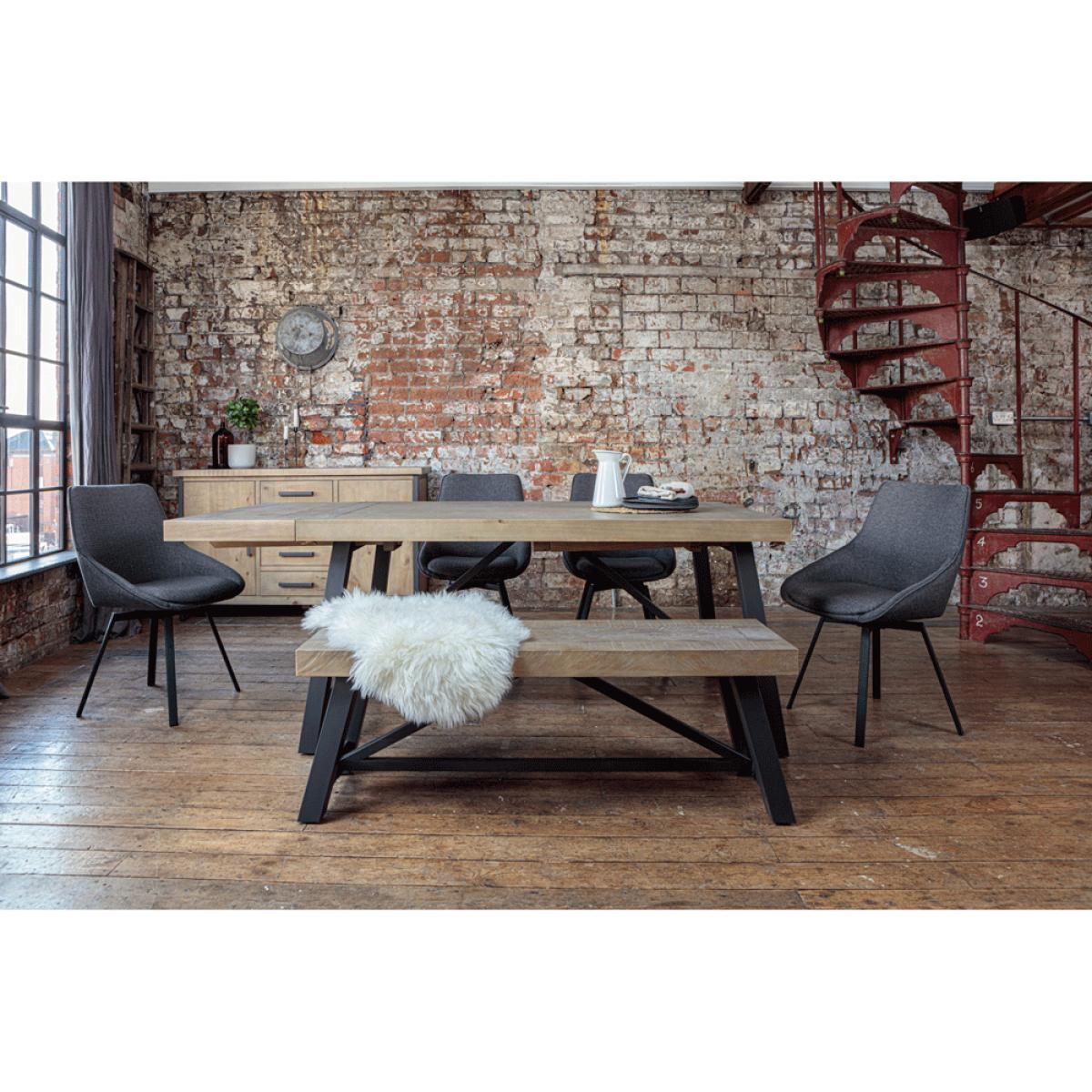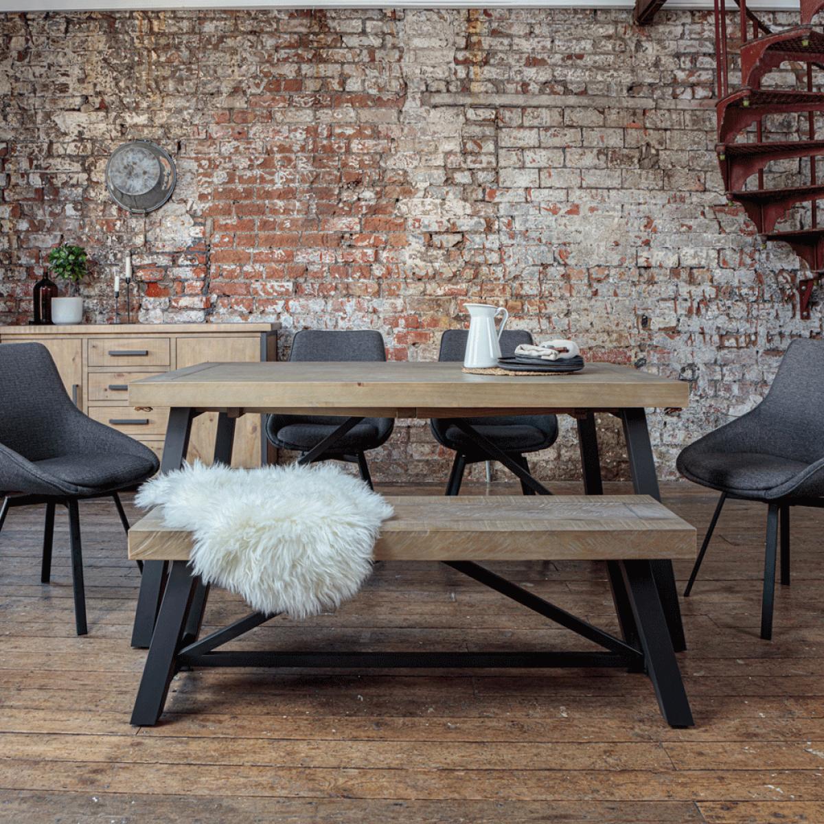 Set price represents a 10% saving when compared with buying all the items individually. Urban 1. 6 metre table set consists of:. Introduce some delectable modern furniture to your space with the stylish Urban dining range. This 1. 6 metre dining set comes with 4 Gaudi dining chairs and small Urban pine bench, therefore this delectable pine table as-is would accommodate 6 people. By further adding the urban extension leaf included within this set it’s possible to boost numbers to 8. If adding a second extension leaf (to be purchased separately) this set could seat up to 10 people. The clever extending jousts are hidden on the table’s underside and therefore this contemporary furniture visually benefits from a lack of central crease, like many other extendable tables tend to have. The lacquer finish of the driftwood tone pine wood combines pleasingly with the dark grey of the gun metal stainless steel base, a sturdy design that’s been powder coated in order to increase its life. The Gaudi fabric dining chairs that accompany this set were paired because of their lovely modern design. The dark grey fabric matches the bases expertly, but the real showpiece is the splayed metal bases. These bases, like the table, have been powder coated for an increased life. A swivel motion is given to the dining chairs meaning socialising is always easy! The Urban bench comes in the same chunky lacquered pine as the table and undeniably suits the set as a whole. Also available is a. 1. 6 metre set with a light grey Gaudi. Chair pairing and. 2 metre table pre determined sets. See the entire Urban range,. Here.