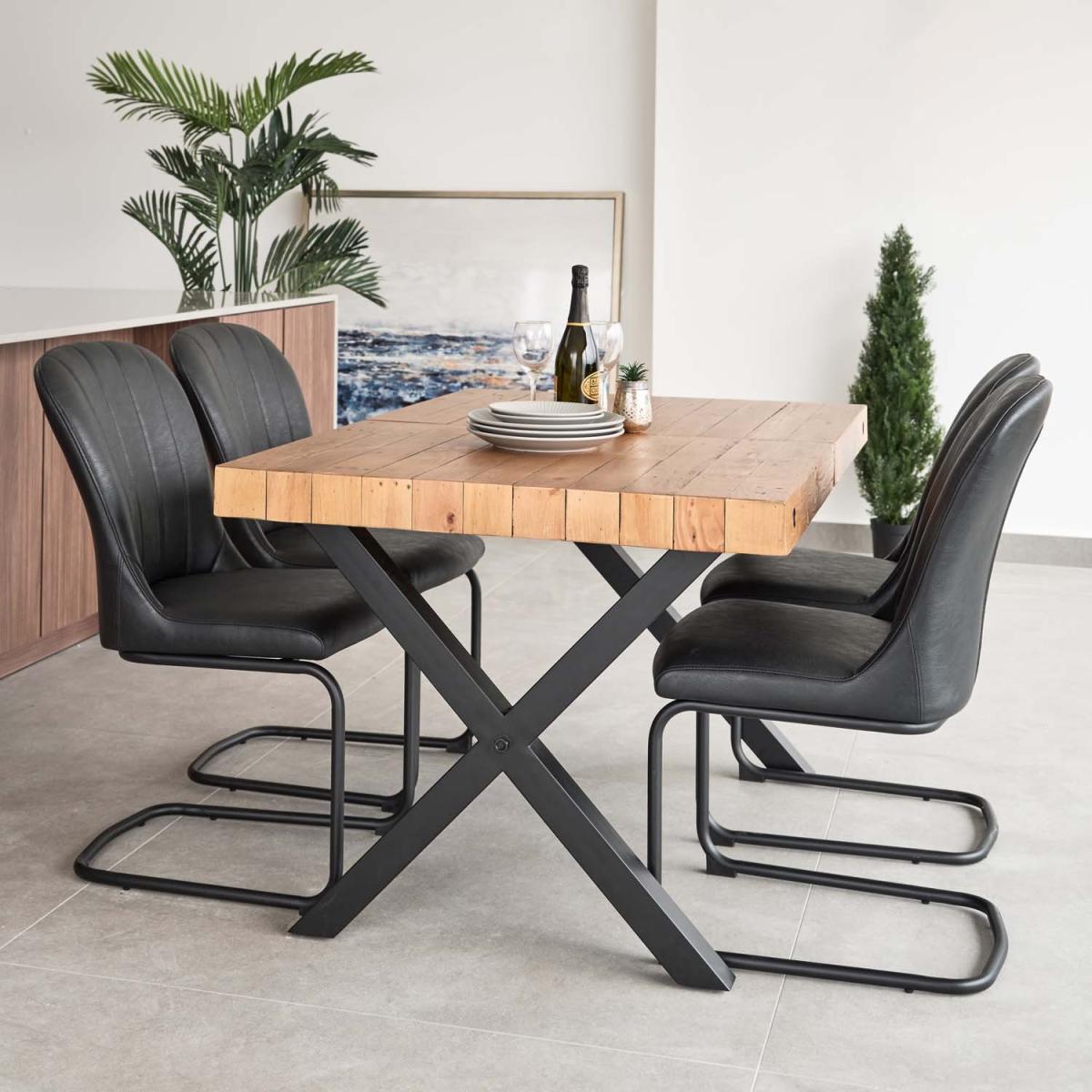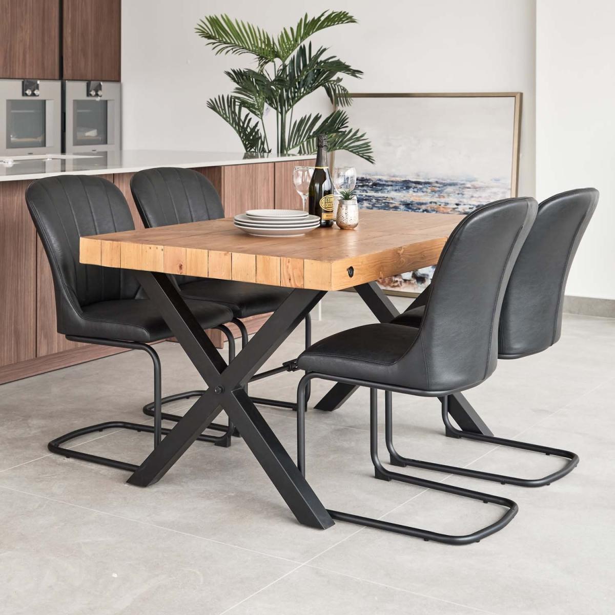 The Urban Extending Dining Table is a practical piece that would make a statement in any dining area. The tabletop is made using reclaimed timber, sanded and finished so it's smooth to the touch but showcasing its history in the unique marks and wood grain. The solid metal legs are cross formed and finished with a black coating. The Firenza Dining Chair has a curved back with a soft and durable faux leather upholstery. The base is a cantilever design which offers a support and a little spring to the back when you relax into it. With a gorgeous chic yet modern look, these four chairs fit perfectly around the Urban extending table.