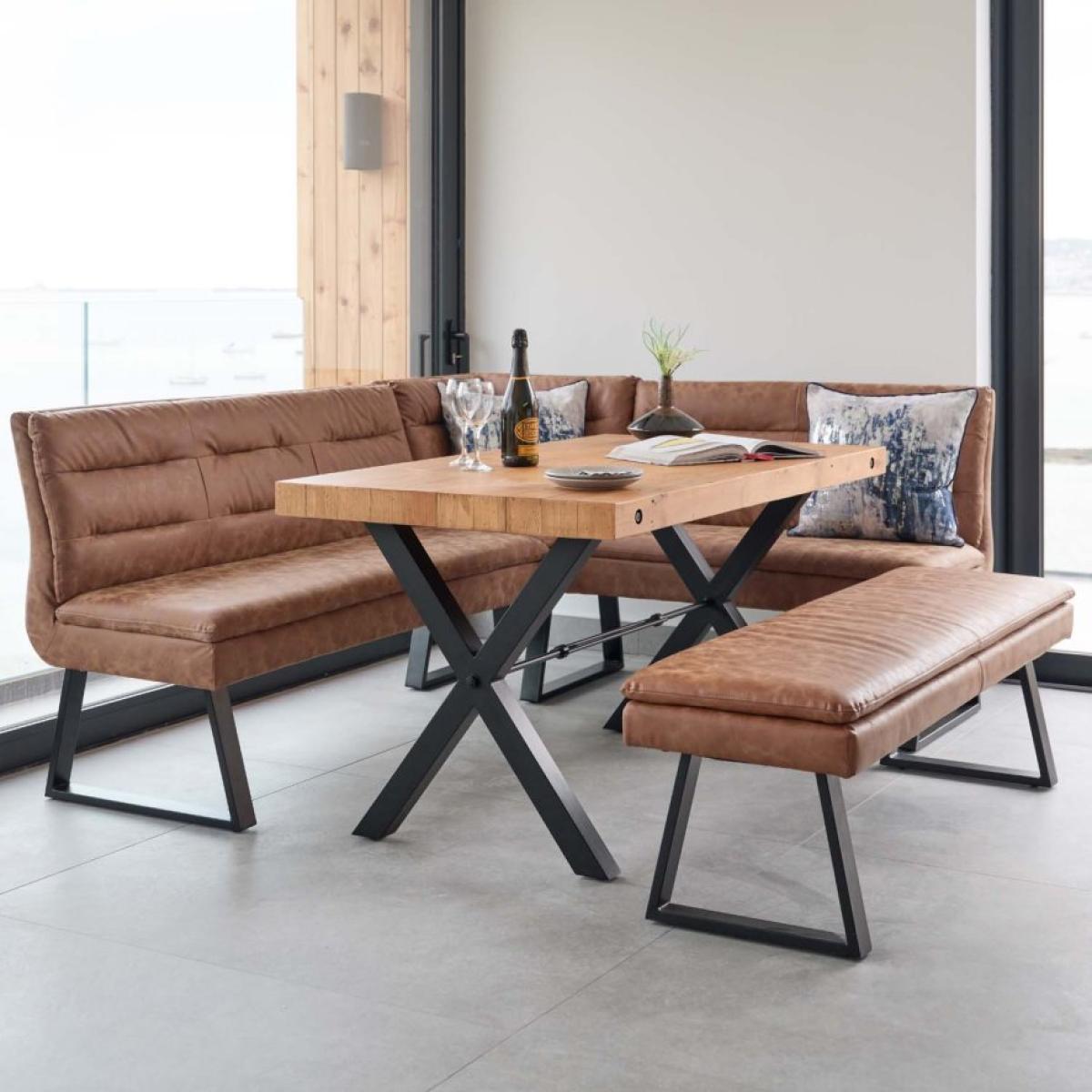 The Urban Dining Table is a practical piece that would make a statement in any dining area. The tabletop is made using reclaimed timber, sanded and finished so it39;s smooth to the touch but showcasing its history in the unique marks and wood grain. The solid metal legs are cross formed and finished with a black coating. The Industrial Corner Bench in a sophisticated tan faux leather upholstery is a stylish addition to your dining area. The corner dining bench is made up of two interlinking sections that can be swapped in position to suit the layout and space available in the room. The corner bench matches perfectly with the fully upholstered Industrial dining bench and is a great companion to our Urban Table. Please note: Reclaimed wood has a history and as a result its own character and uniqueness. It may have been used for buildings and structures over many years. It is a rustic material and no two pieces are the same. Random markings holes are a standard feature of reclaimed wood....