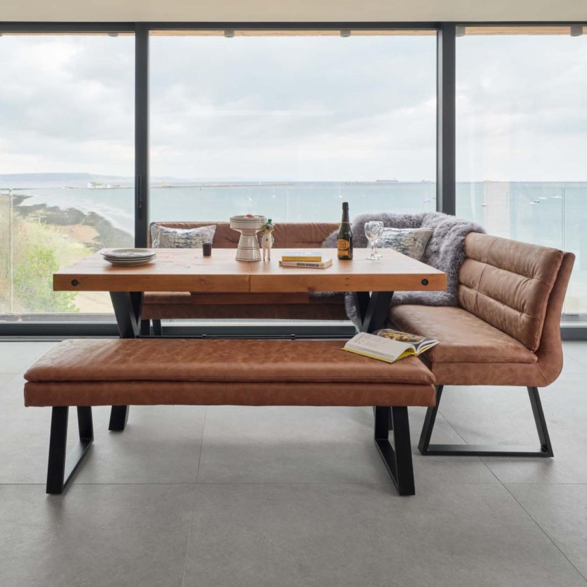 The Urban Extending Dining Table is a practical piece that would make a statement in any dining area. The tabletop is made using reclaimed timber, sanded and finished so it39;s smooth to the touch but showcasing its history in the unique marks and wood grain. The solid metal legs are cross formed and finished with a black coating. The Industrial Corner Bench in a sophisticated tan faux leather upholstery is a stylish addition to your dining area. The corner dining bench is made up of two interlinking sections that can be swapped in position to suit the layout and space available in the room. The corner bench matches perfectly with the fully upholstered Industrial dining bench and is a great companion to our Urban Table. Please note: Reclaimed wood has a history and as a result its own character and uniqueness. It may have been used for buildings and structures over many years. It is a rustic material and no two pieces are the same. Random markings holes are a standard feature of reclai...