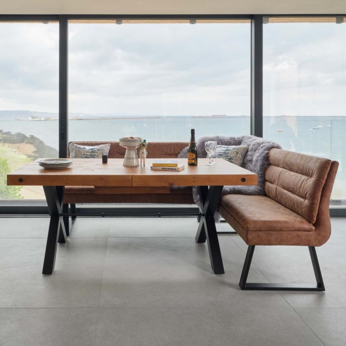 The Urban Extending Dining Table is a practical piece that would make a statement in any dining area. The tabletop is made using reclaimed timber, sanded and finished so it39;s smooth to the touch but showcasing its history in the unique marks and wood grain. The solid metal legs are cross formed and finished with a black coating. The Industrial Corner Bench in a sophisticated tan faux leather upholstery is a stylish addition to your dining area. The corner dining bench is made up of two interlinking sections that can be swapped in position to suit the layout and space available in the room. The corner bench is a great companion to our Urban Table. Please note: Reclaimed wood has a history and as a result its own character and uniqueness. It may have been used for buildings and structures over many years. It is a rustic material and no two pieces are the same. Random markings holes are a standard feature of reclaimed wood.. *Table size:W180cm-240cm x H76cm x D90cm *Corner Bench size:T...