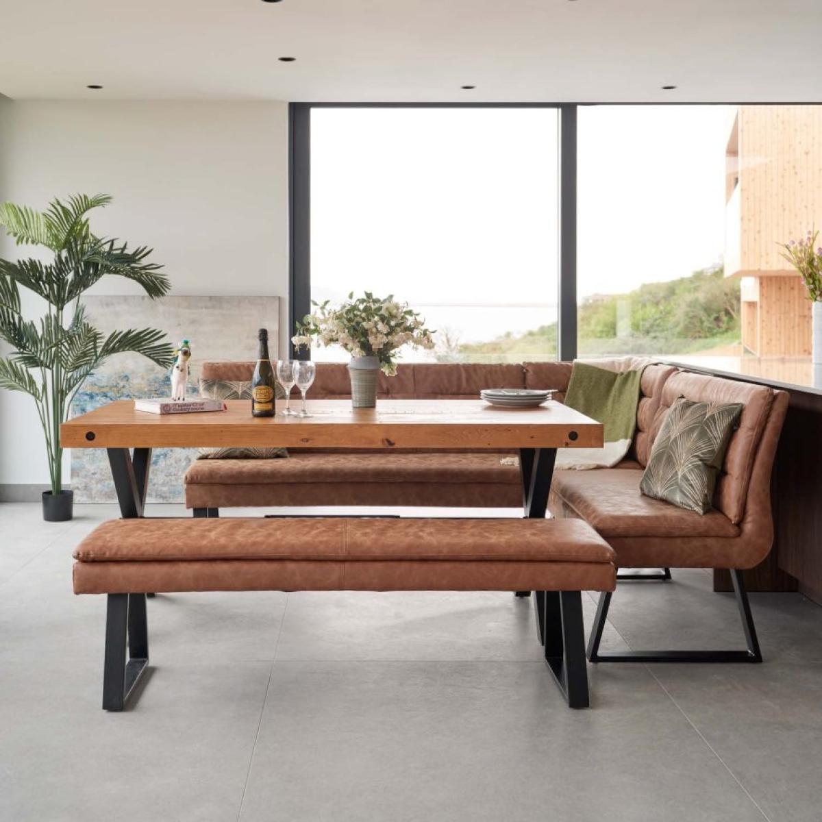 The Urban Dining Table is a practical piece that would make a statement in any dining area. The tabletop is made using reclaimed timber, sanded and finished so it39;s smooth to the touch but showcasing its history in the unique marks and wood grain. The solid metal legs are cross formed and finished with a black coating. The Industrial Corner Bench in a sophisticated tan faux leather upholstery is a stylish addition to your dining area. The corner dining bench is made up of two interlinking sections that can be swapped in position to suit the layout and space available in the room. The corner bench matches perfectly with the fully upholstered Industrial dining bench and is a great companion to our Urban Table. Please note: Reclaimed wood has a history and as a result its own character and uniqueness. It may have been used for buildings and structures over many years. It is a rustic material and no two pieces are the same. Random markings holes are a standard feature of reclaimed wood....