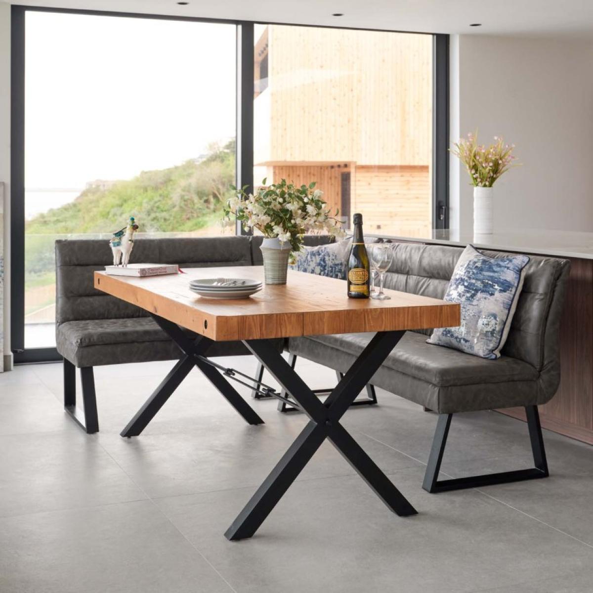 The Urban Dining Table is a practical piece that would make a statement in any dining area. The tabletop is made using reclaimed timber, sanded and finished so it39;s smooth to the touch but showcasing its history in the unique marks and wood grain. The solid metal legs are cross formed and finished with a black coating. The Industrial Corner Bench in a sophisticated deep grey faux leather upholstery is a stylish addition to your dining area. The corner dining bench is made up of two interlinking sections that can be swapped in position to suit the layout and space available in the room. The corner bench is a great companion to our Urban Table. Please note: Reclaimed wood has a history and as a result its own character and uniqueness. It may have been used for buildings and structures over many years. It is a rustic material and no two pieces are the same. Random markings holes are a standard feature of reclaimed wood.. *Table size:W:180cm H:76cm D:90cm *Corner Bench size:Total Length...