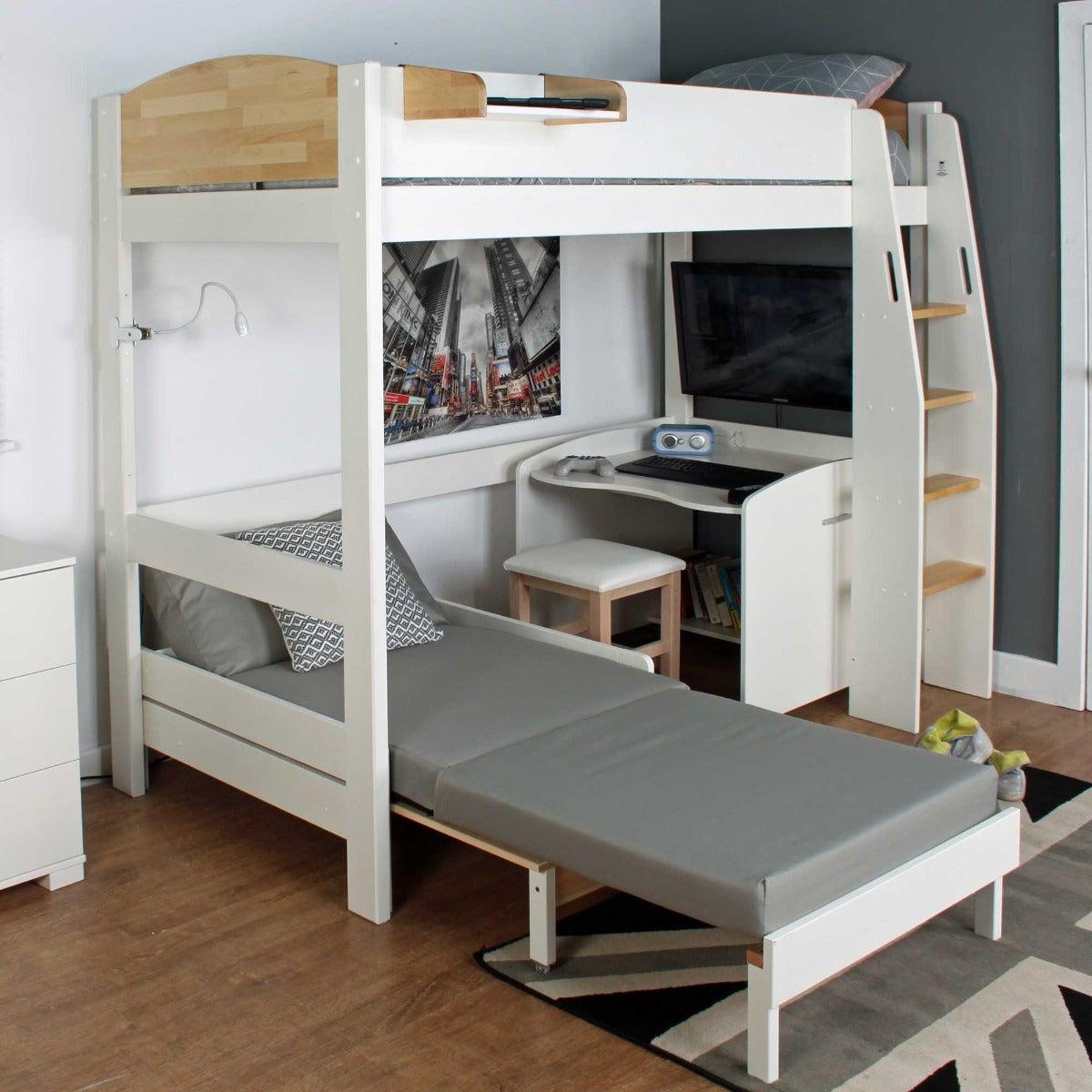 Design. Full of functionality and space-saving style, the Urban Birch high sleeper with desk and futon is designed with comfort and practicality in mind. Built into the nook beneath the bed, a futon provides everyday seating as well as an additional sleeping spot. On castors for ease of movement, the desk fits snugly into the frame at both angles, perfect for homework, gaming and watching TV. Finished in timeless white and birch, this solid wood children's bed will stay up-to-date for years to come.
