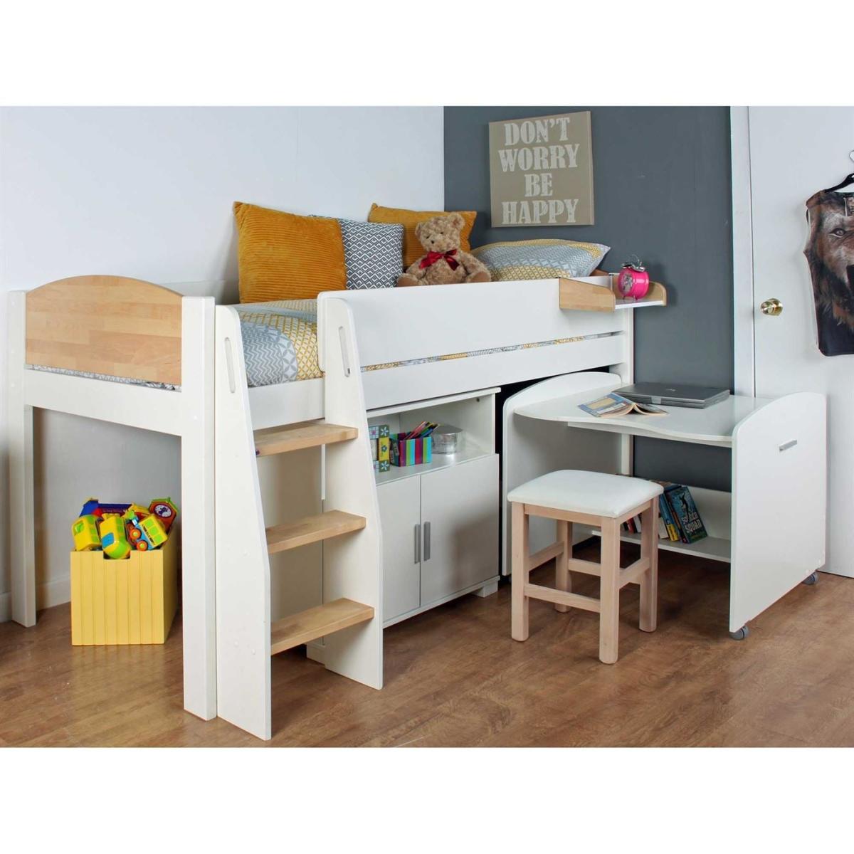 Design. Bringing together sleep, study and storage, the Urban Birch mid sleeper bed with pull out desk and cupboard lets your child enjoy every inch of their bedroom. In a classic, fresh white hue with birch wood detail, it will continue to look great as they grow. Fitting perfectly underneath the raised bed, a compact cupboard and desk ensure no space is being wasted. On wheels, the desk can be rolled out come homework time, and then returned to its home to make way for play. A cosy nook at the end of the bed can be used for hiding away clutter, or for something more fun.