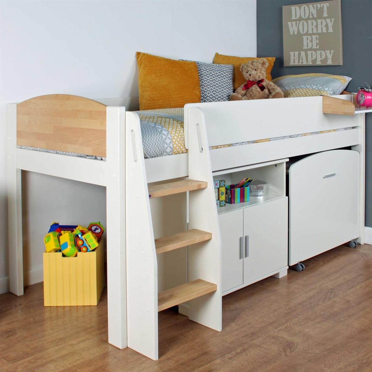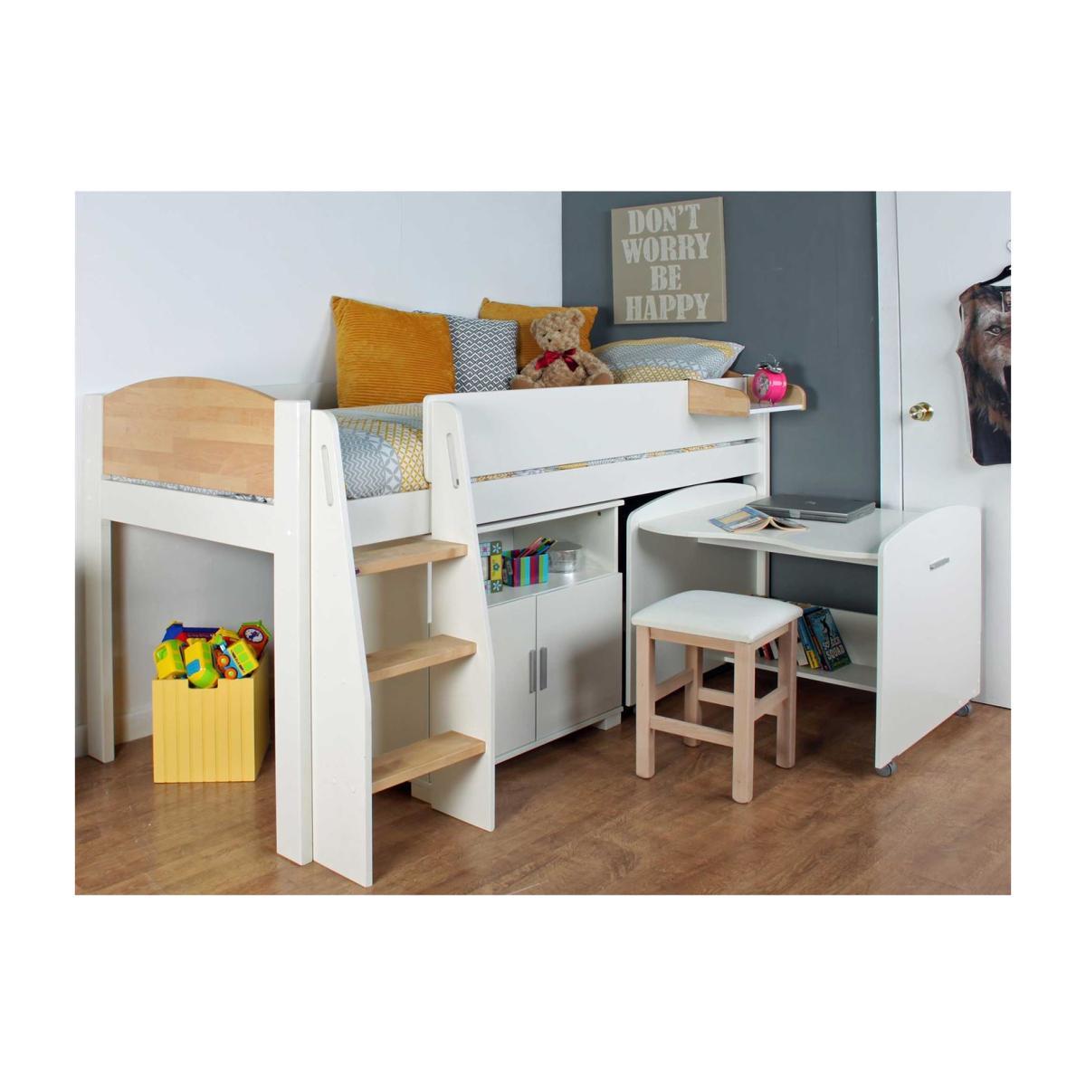 Design. Bringing together sleep, study and storage, the Urban Birch mid sleeper bed with pull out desk and cupboard lets your child enjoy every inch of their bedroom. In a classic, fresh white hue with birch wood detail, it will continue to look great as they grow. Fitting perfectly underneath the raised bed, a compact cupboard and desk ensure no space is being wasted. On wheels, the desk can be rolled out come homework time, and then returned to its home to make way for play. A cosy nook at the end of the bed can be used for hiding away clutter, or for something more fun.