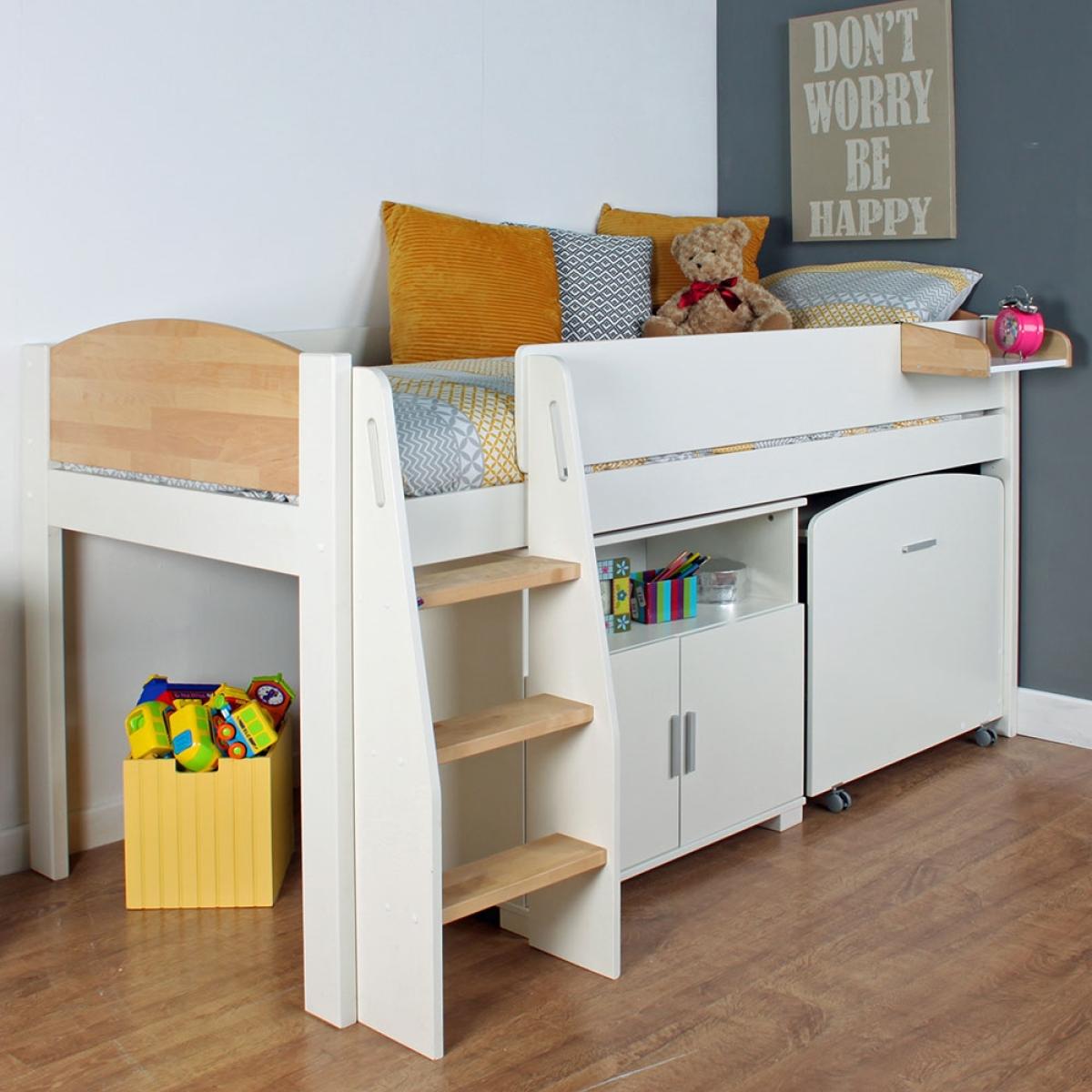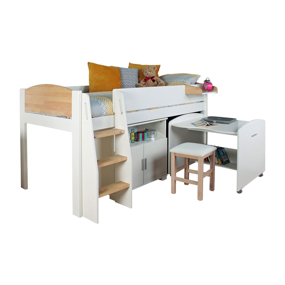 Struggling for space and you need more storage for all those socks that always seem to go missing, then look no further with the Urban Birch Mid Sleeper 2 bed in White and Birch. Tired of treading on toys, its no longer a problem with the 2 door cupboard with shelf that neatly tucks away, so your youngster can store all of their hidden trinkets and treasures. The brilliant pull out desk with added castors for easy moving and an extra shelf for those extra pencils and pens, is the perfect space for studying. With the natural finish and the benefit of the free standing cupboard and desk, your kids can arrange and personalise their room any way they wish! After a long day of study and play, they can clamber up the ladder, and have a well earned snooze. This brilliant bed also has some optional extras to choose from, a clip-on shelf for bedtime beverages and don't forget your bendy bunk light for late night reading!.