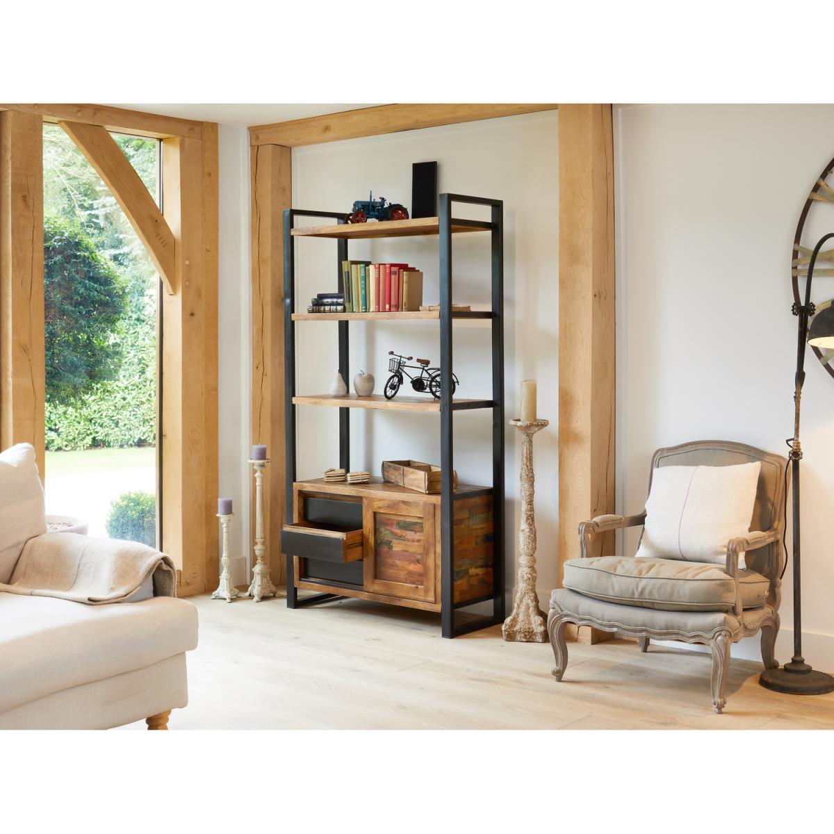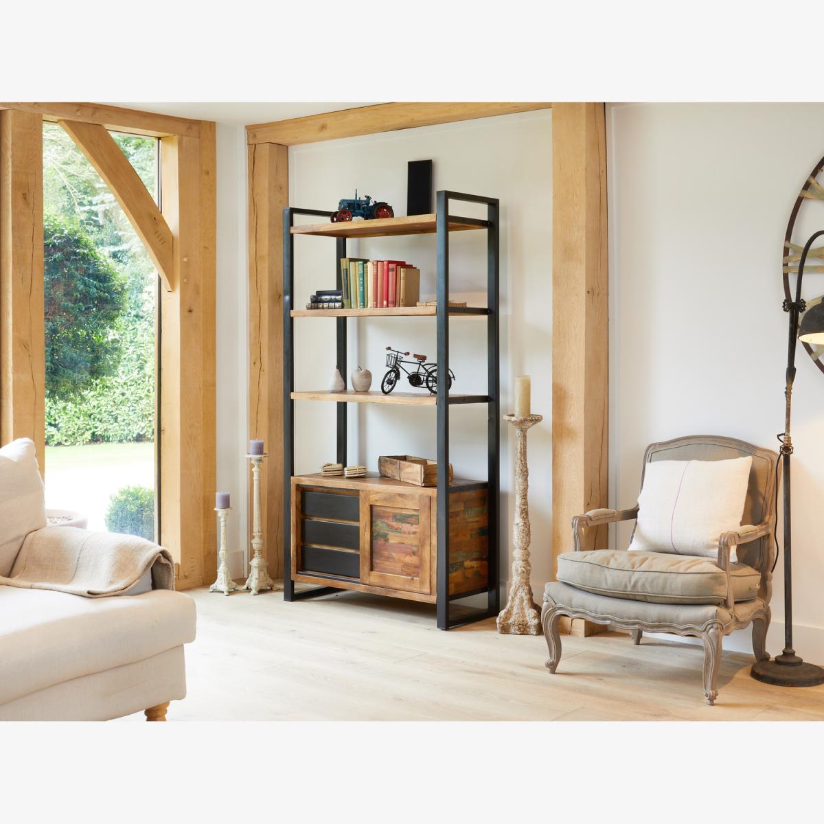 This unique shelving and storage unit is made from reclaimed Indian wood. It has 3 shelves at the top which are held together with a steel structure. Below there are set of 3 drawers to one side and a sliding door that has extra storage space on the other. The grain and colour of the wood is protected using a clear lacquer to give sheen and longevity.