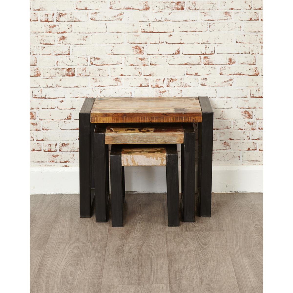 A beautiful nest of 3 steel structured coffee tables that will look great with matching furniture or as an accent. These are a solid set of tables that look great individually or stacked together. Finished in a clear lacquer that accentuates the colourful reclaimed wood.