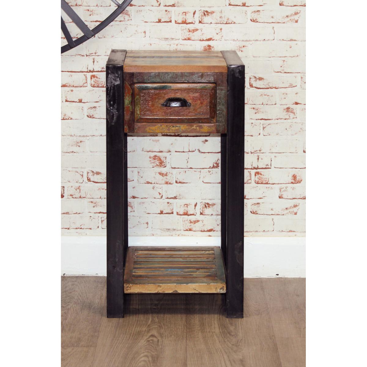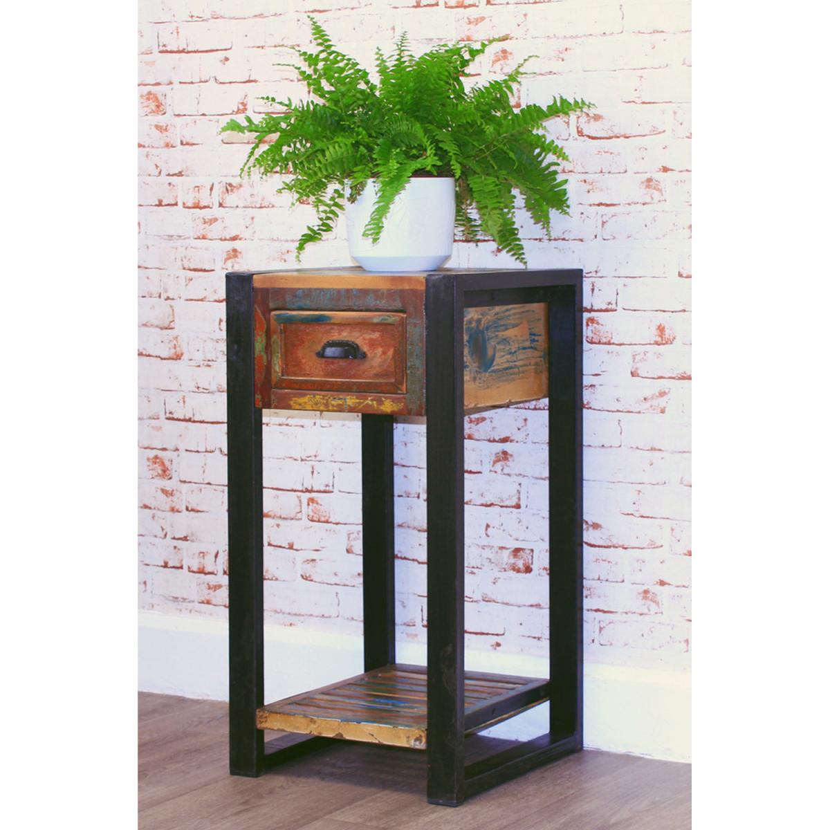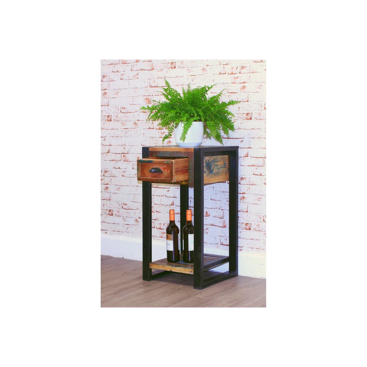 A plant stand made from reclaimed Indian wood unique both in design and looks. With a single drawer and storage shelf this is a great platform to display your plants on. Finished with the signature steel frame, light lacquer and iron handle on the drawer. Urban chic plant standlamp table. Made from reclaimed wood salvaged from old buildings in southern India. Part of the Baumhaus urban chic collection, colourful furniture for stylish living.