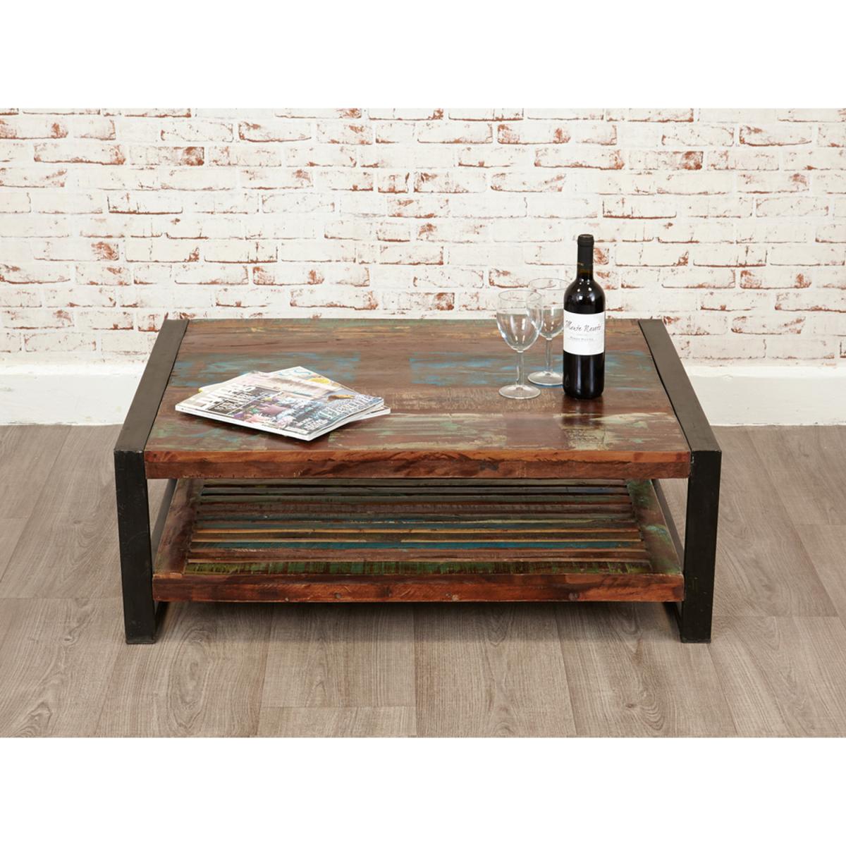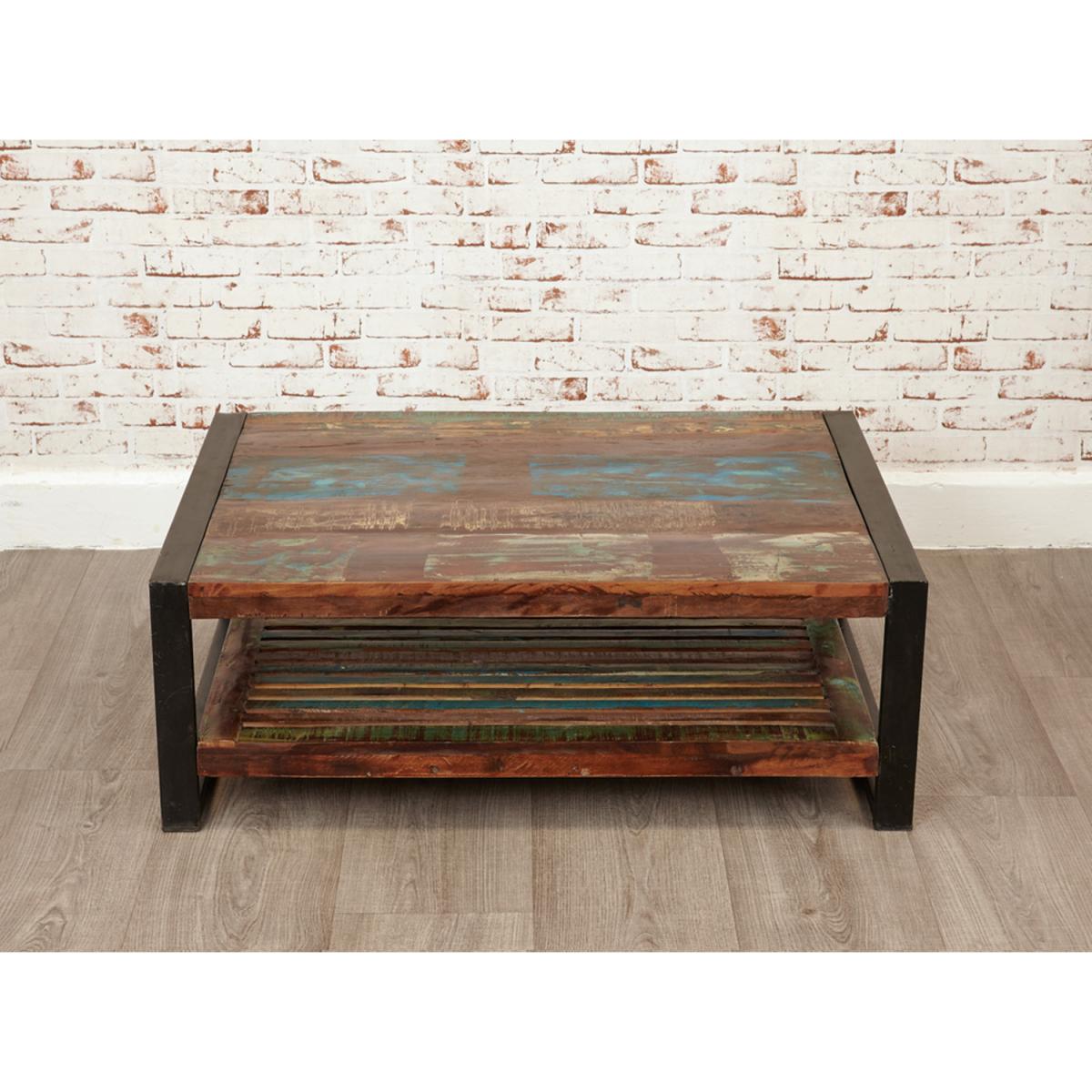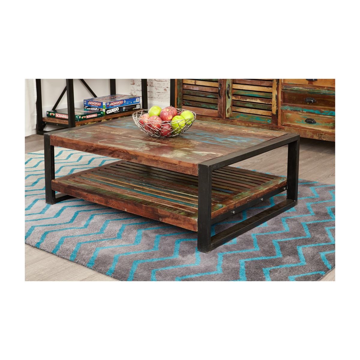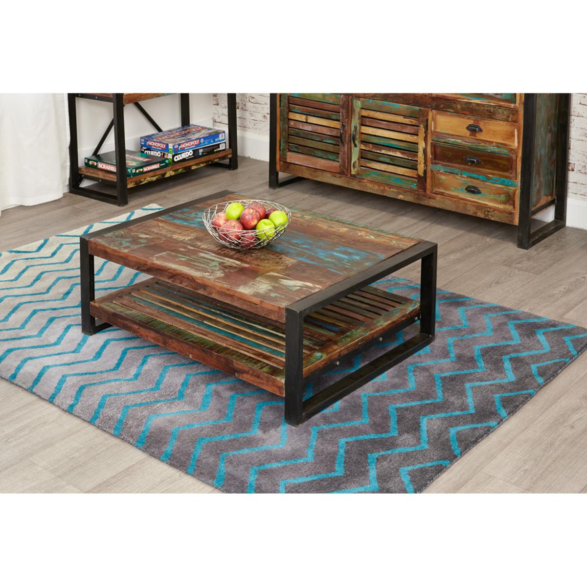 This robust and colourful rectangular coffee table is finished in a light lacquer which accentuates the colourful grain and texture of the reclaimed wood. A great focus point for your living room it also has a slatted shelf underneath for extra storage. Finished with all the signature Urban Chic fittings.