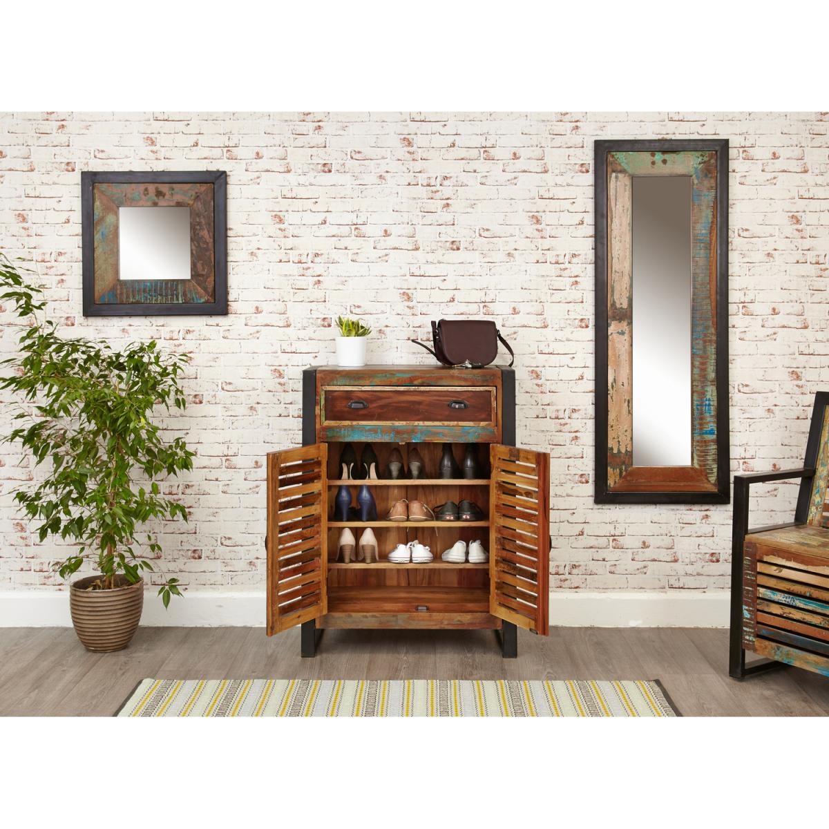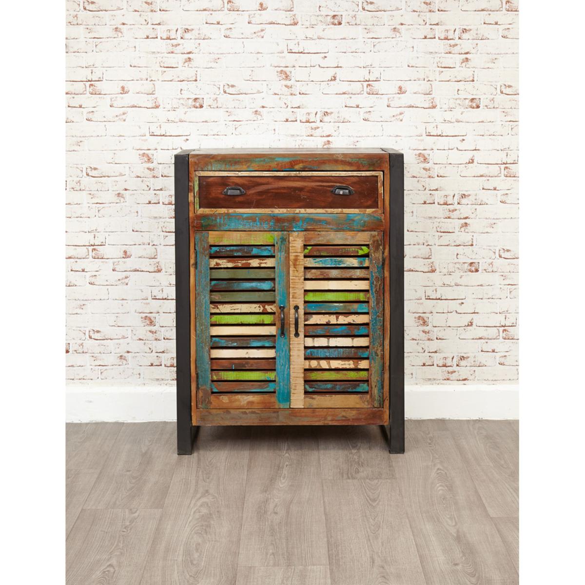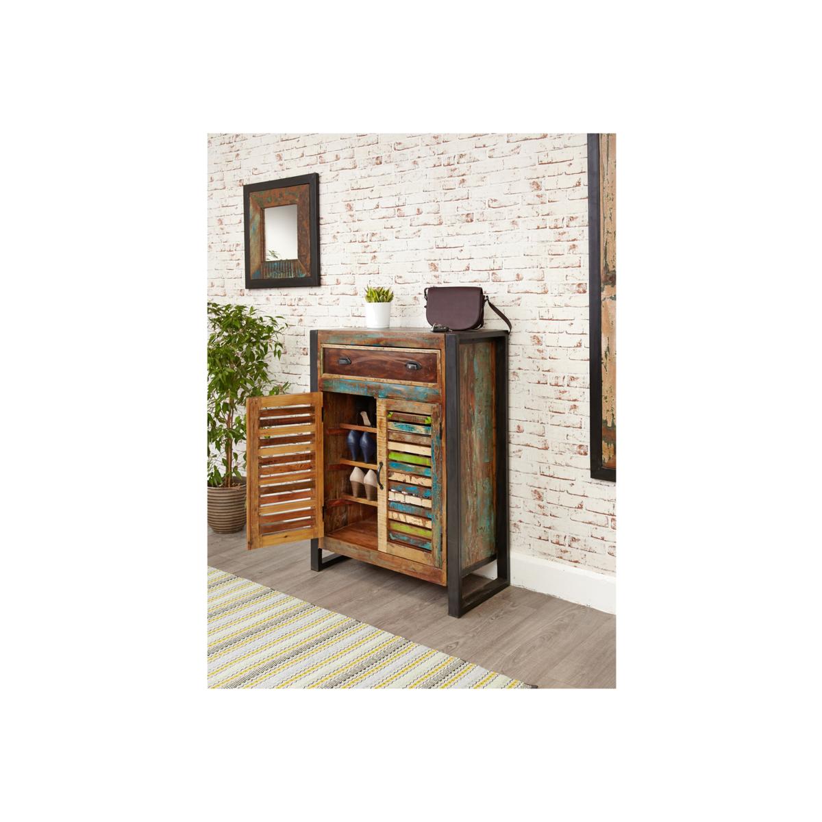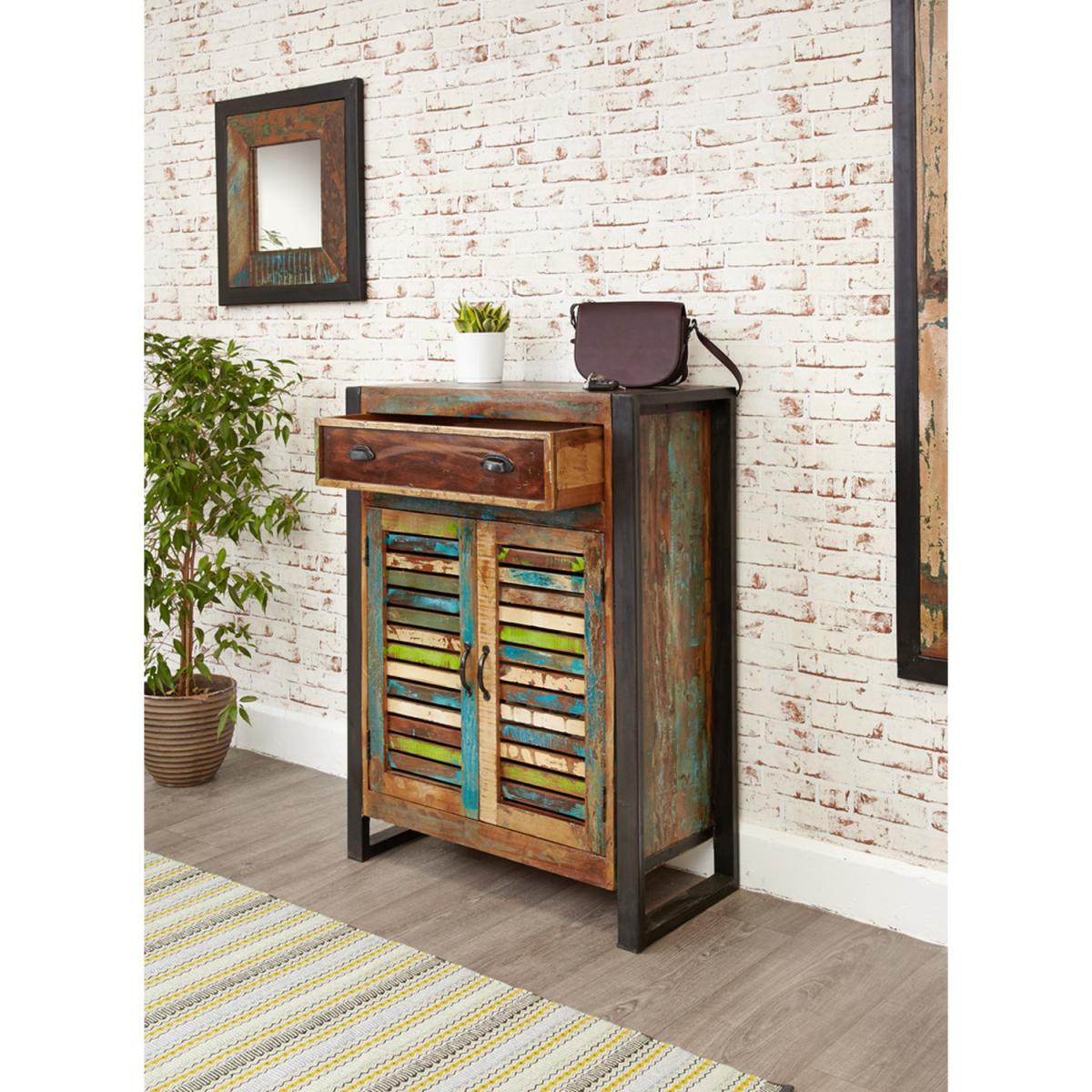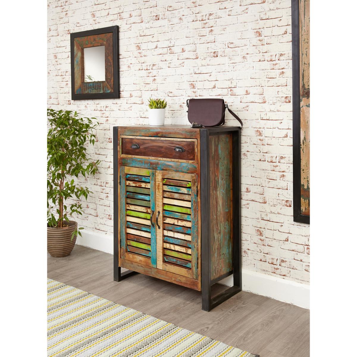 Urban chic shoe storage cupboard cabinet with drawer. Made from reclaimed wood salvaged from old buildings in southern India. Part of the Baumhaus urban chic collection, colourful furniture for stylish living.