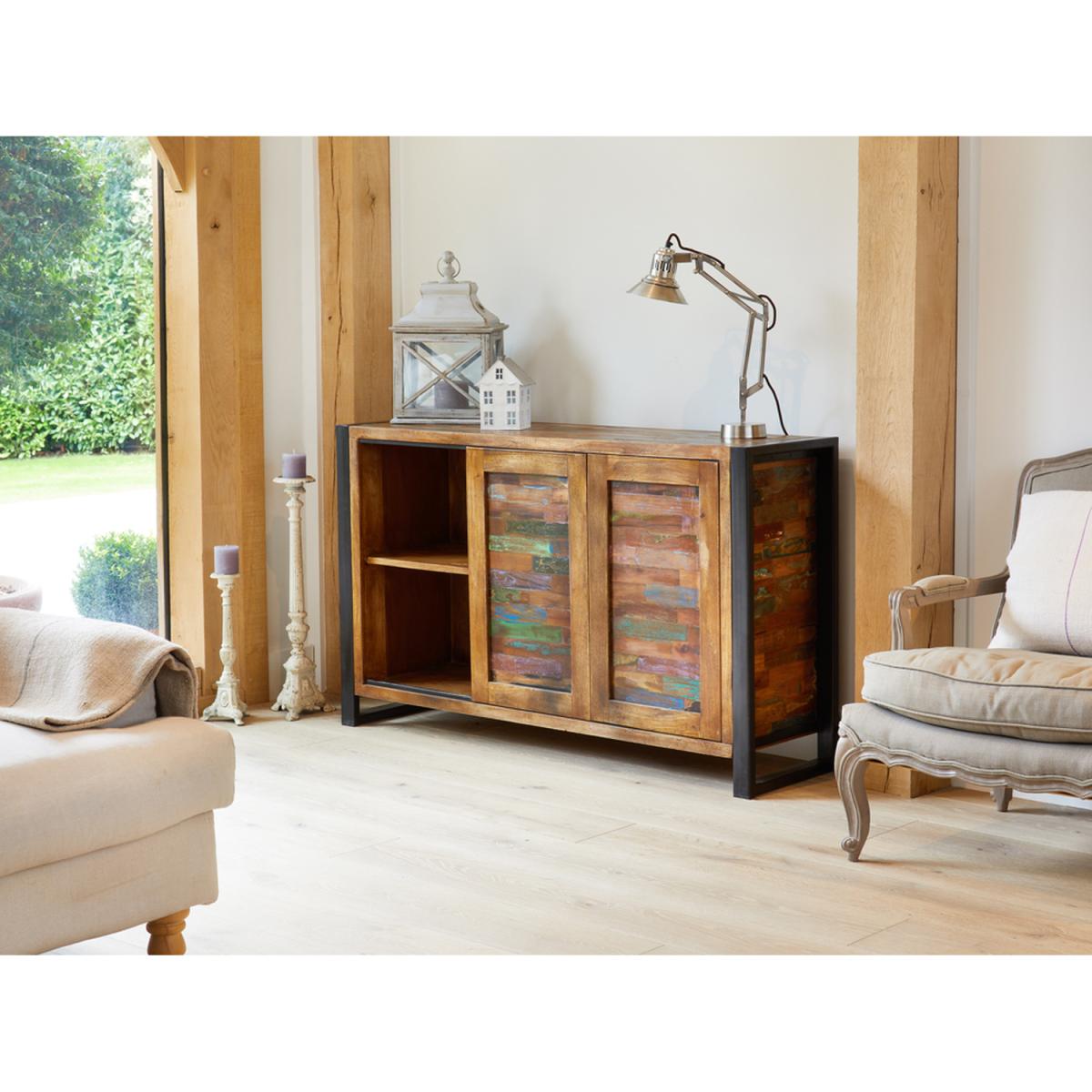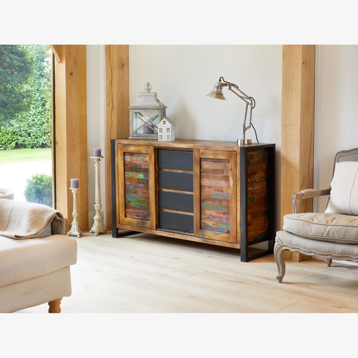 This unique shelving and storage unit is made from reclaimed Indian wood. It has 4 drawers down the middle with a storage shelf on either side. There are 2 sliding doors which perform across the entire sideboard, giving you coverage where you need it. The grain and colour of the wood is protected using a clear lacquer to give sheen and longevity.