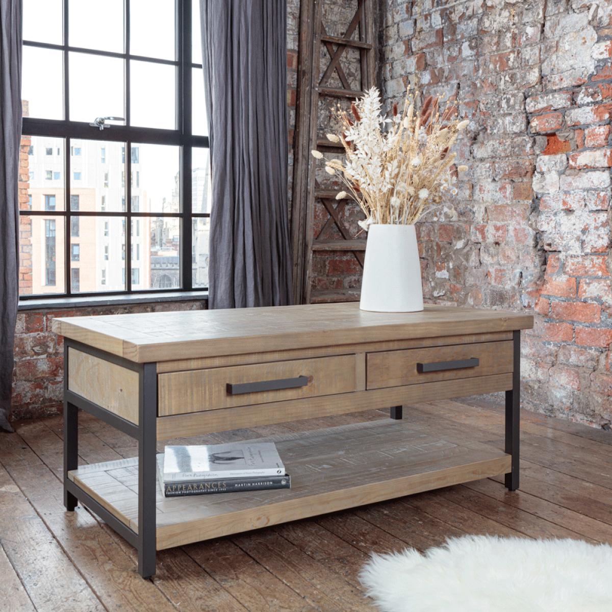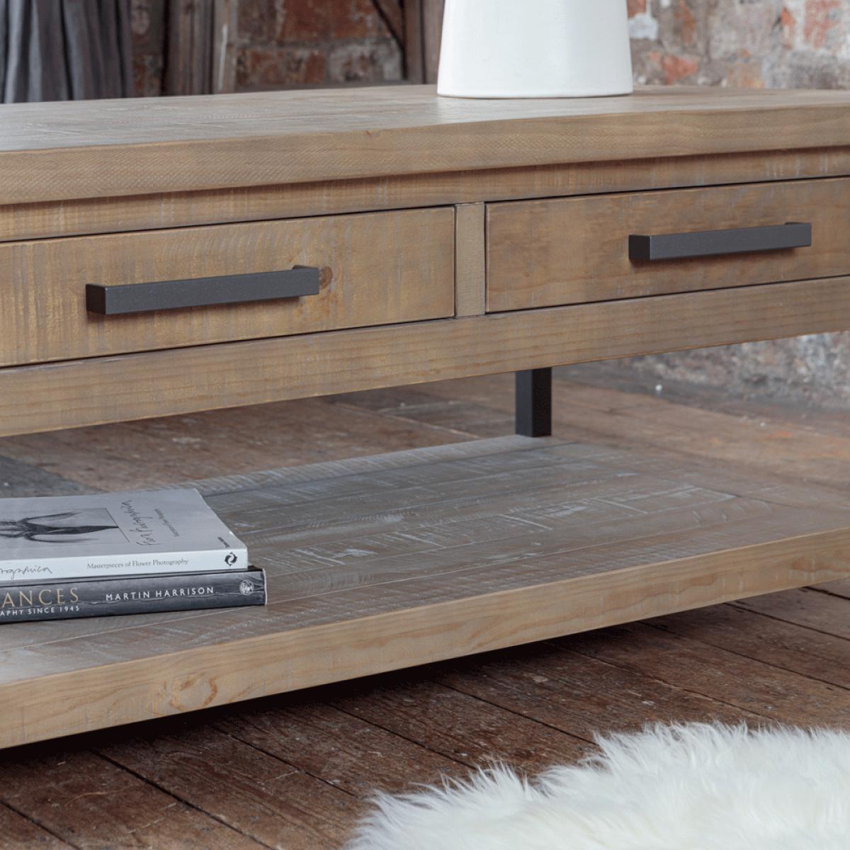 The Urban coffee table is a stylish pine table that will slide into many modern homes with ease. This contemporary coffee table has appealing chunky pine surfaces and takes its cues from industrial warehouse decor as well as the rustic. Benefitting from exposed powder coated steel finishes of gun metal grey, it’s not all about the likeable modern appearance either – practicality is built into this pine table. Two wide drawers are key for hide away storage, their handles showcasing the same tasteful gun metal grey as the legs. There’s a handy elevated underlying shelf too, perfect for placing belongings needed more frequently, controllers, newspapers and magazines for example. The driftwood pine finish is seen across the entire range, creating a shade that really complements much home decor and speaks to a rural style also. We love how a raw-urban style is truly fused with the rustic in this modern living room furniture. This coffee table would pair expertly with any number of options from the. Urban Range.