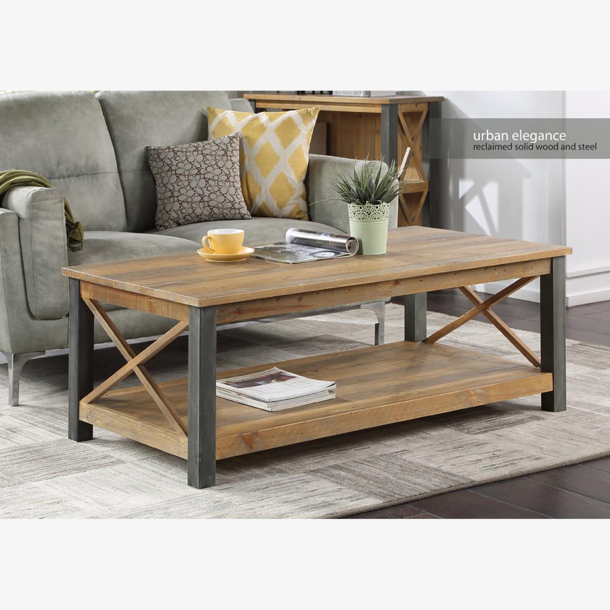 With striking unique reclaimed features this large coffee table will make a beautiful focal point in your living room. Sturdy with its steel legs and cross design in the frame, this table is crafted from 100 reclaimed wood for a design which celebrates the natural beauty of wood with all its charming imperfections. With a large table top space and a lower shelf ideal for tucking away remotes, controllers and magazines to keep your living room clear from clutter. Finished in a resilient satin lacquer for durability and to enhance the unique tones and natural imperfections of the wood.