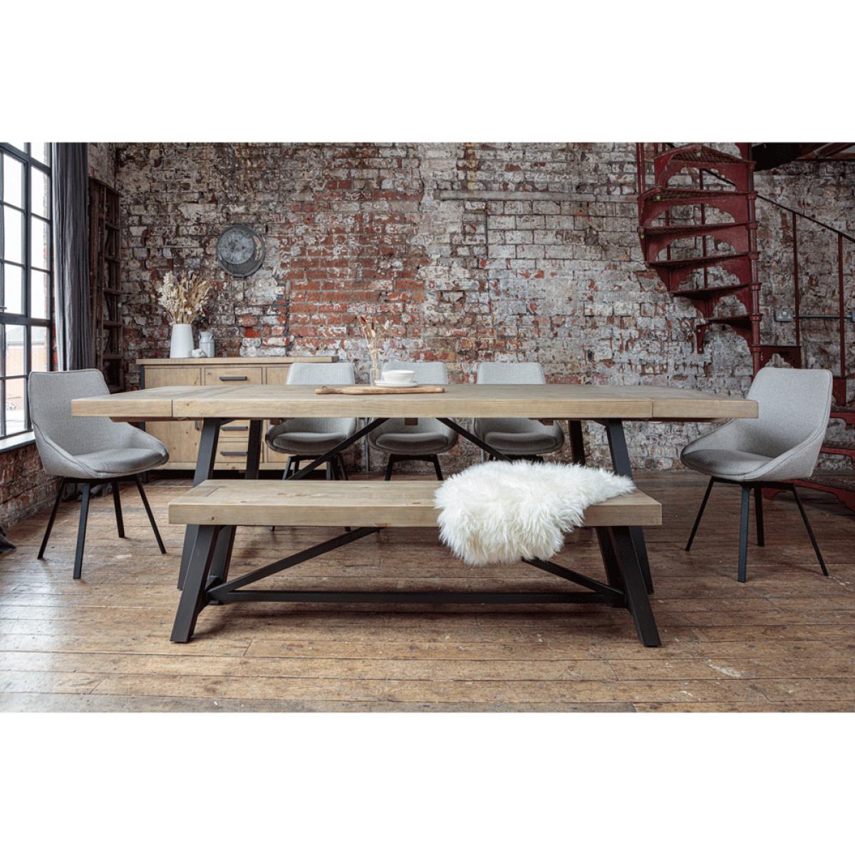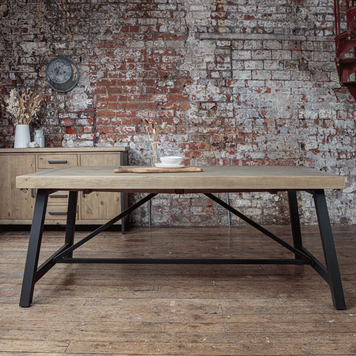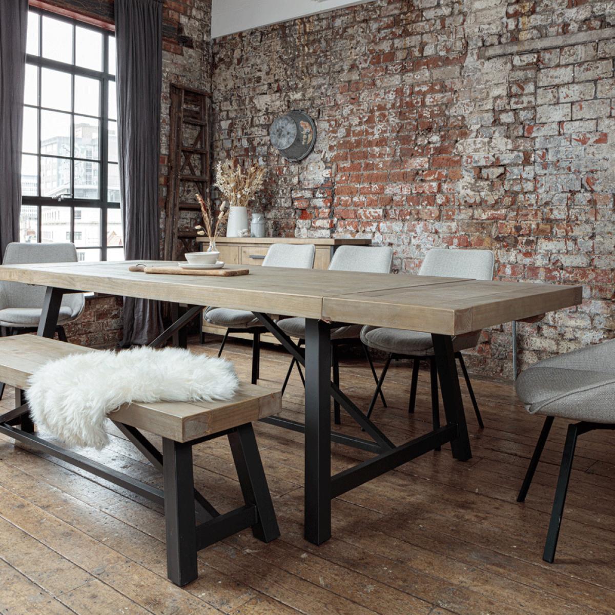 Introduce some industrial style to your dining room with The Urban Extending Dining Table. The Urban 2 Metre Extendable Dining Table boasts finishes of gorgeous tactile lacquered driftwood pine which excellently combine with dark grey gun metal stainless steel bases. Undeniably industrial in style with more than a pinch of rustic charm, this dining table is bound to slot into many homes with ease. The driftwood brown tone of the chunky pine surface is created from a lacquering process, meaning it will face the day to day with ease. The table legs are dark grey gun metal but have also been powder coated to prevent damage over time. This pine table is also able to extend with the. Urban extension leaf, sold separately. With one inserted you can add two more diners. The table is available as a. 1. 6 metre option. , also. Unlike many other extendable dining tables that have a central extension leaf, the extension for this table adds onto the end, therefore not affecting the aesthetic of the table. Central leaf extending dining tables, by their very nature, have a join running down the middle of the table’s top, which you don’t have on this set. To extend this table you simply slot in one or two extending leaves into the channels at either end and fasten underneath to secure. Discount available if purchased as part of a dining set. Why not check out some of the other products available in the. Urban Range.